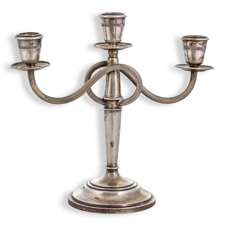 realizzato a tre fiamme, con bracci sagomati e stelo a balaustro
