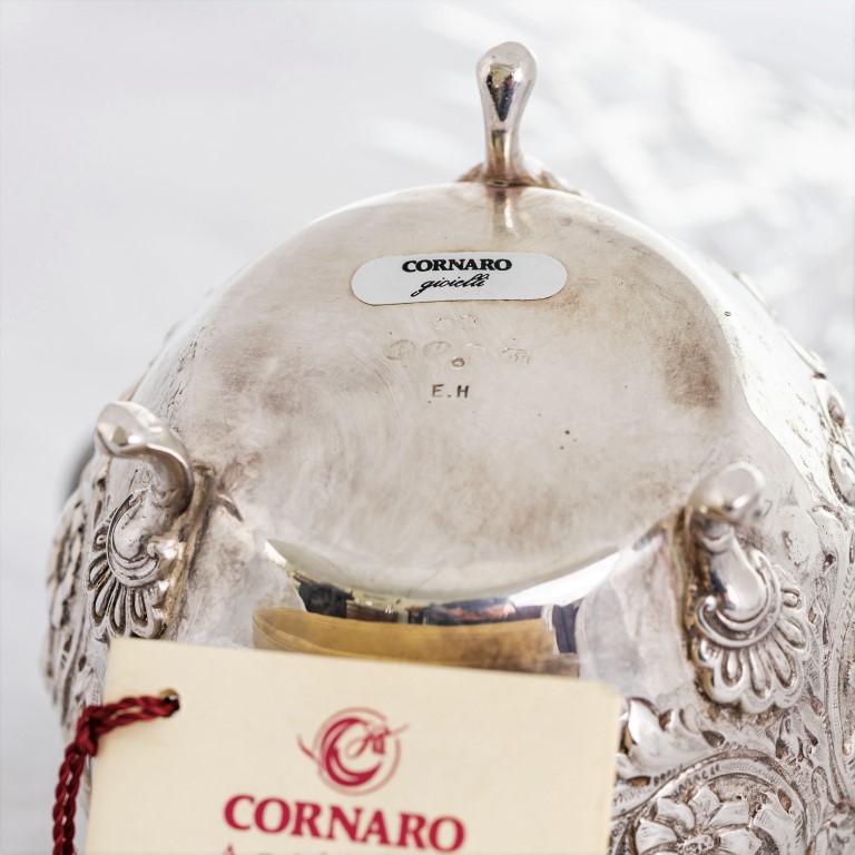 composto da una formaggera con coppa in cristallo intagliato a punte di diamante, un vasetto in sheffield cesellato a volute di acanto, sei forchettine con terminali a frutto, una pinza da ghiaccio ed un piccolo portaghiaccio in cristallo intagliato