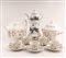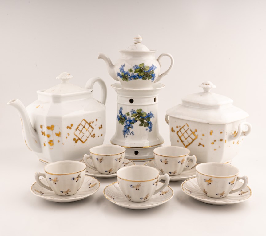 Buonanotte Ginori in porcellana bianca a fiori, caffettiera e zuccheriera, Francia fine sec. XIX, in porcellana bianca-oro e 5 tazzine da caffè con piatto, Anni Trenta, Ginori