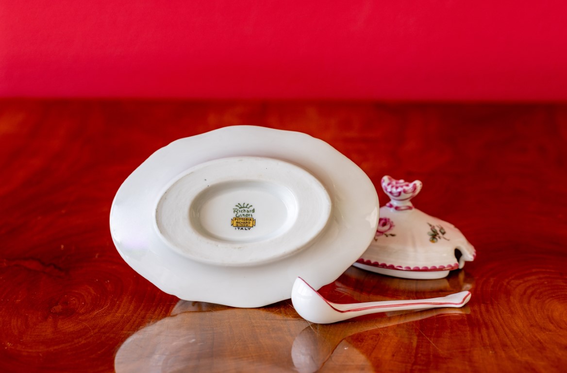 realizzata con decoro Amalfi, deocorata a decalcomania e ritoccata a mano, marchio oro 'Pittoria Richard Ginori, Italy'