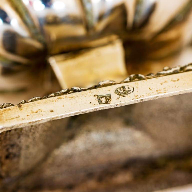 realizzata a forma quadrangolare con bordo a motivi fitomorfi su piede quadrangolare, facitore GN, interno dorato