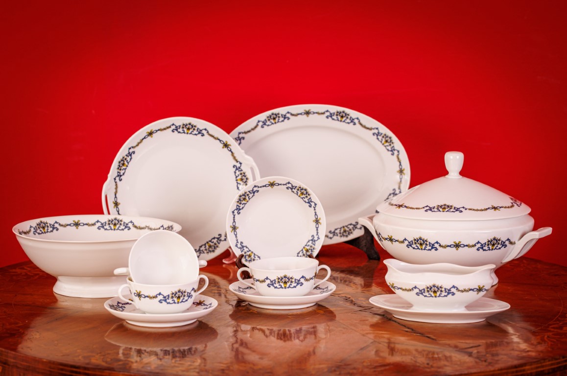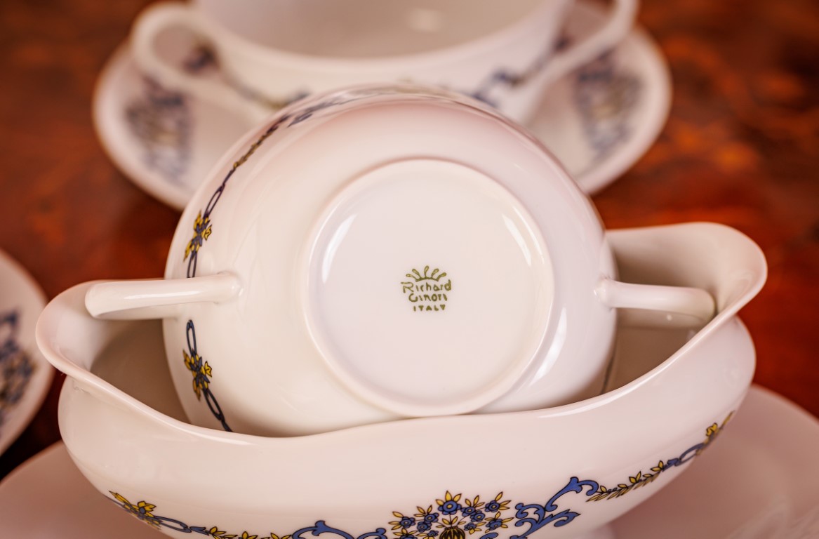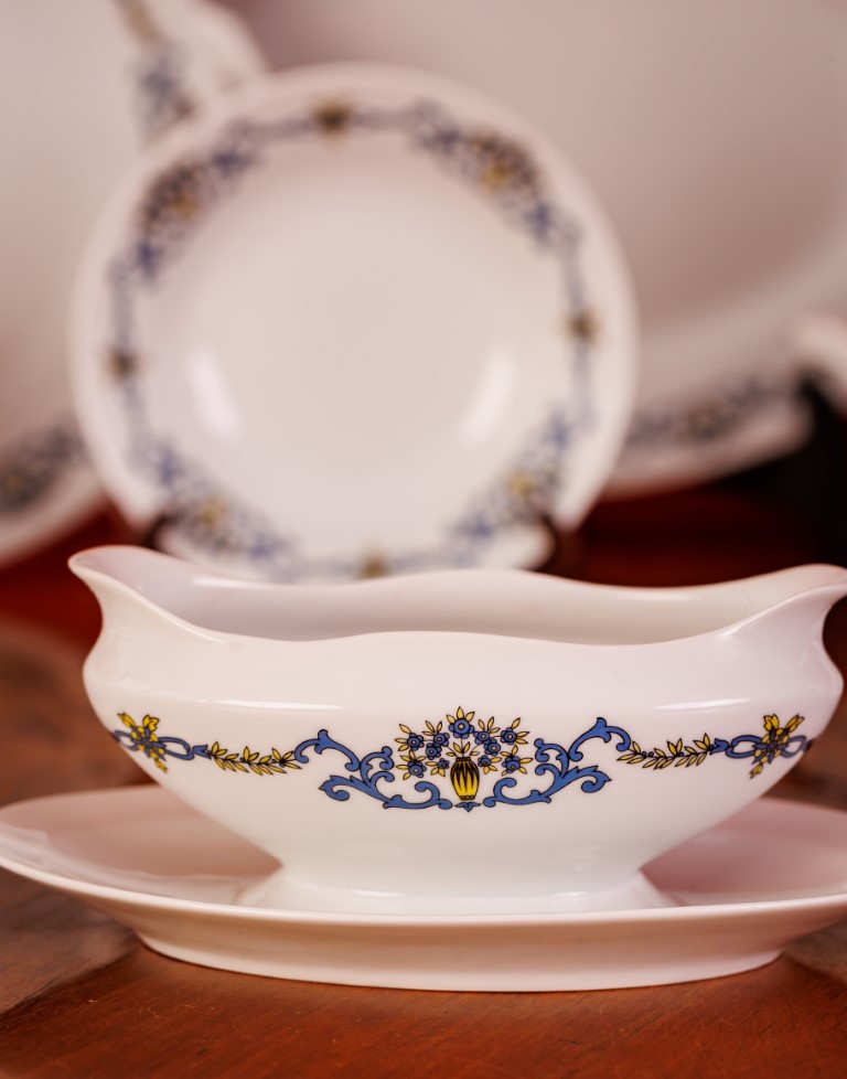 decorato con motivo a vasi di fiori tra girali nei toni del blu e del giallo, composto da 12 piatti piani, 5 scodelle, 24 piatti frutta di due misure diverse, 6 tazze brodo con piatto, 6 coppette macedonia, 1 zuppiera con coperchio, 1 insalatiera, 1 raviera, 1 salsiera, 2 vassoi tondi, 1 vassoio ovale, 1 vassoietto tondo con manici e 1 piatto frutta filato