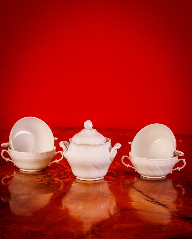composto da 5 tazze da brodo e 1 zuccheriera in porcellana bianca, modello 'Vecchio Ginori'