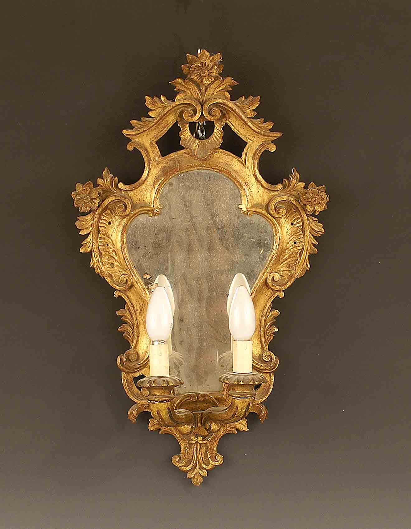 Applique in legno scolpito e dorato a motivo di volute, vecchia manifattura, cm. 58x35.