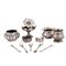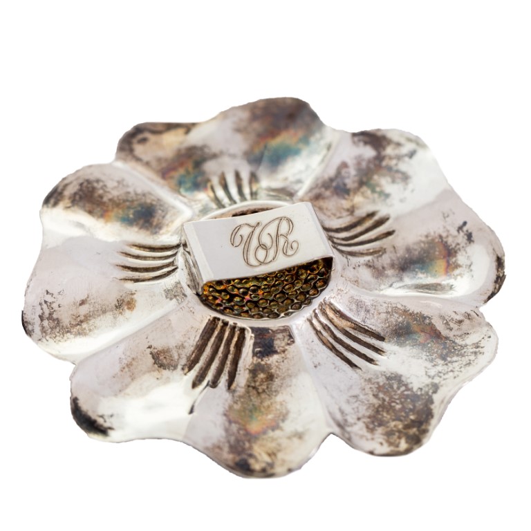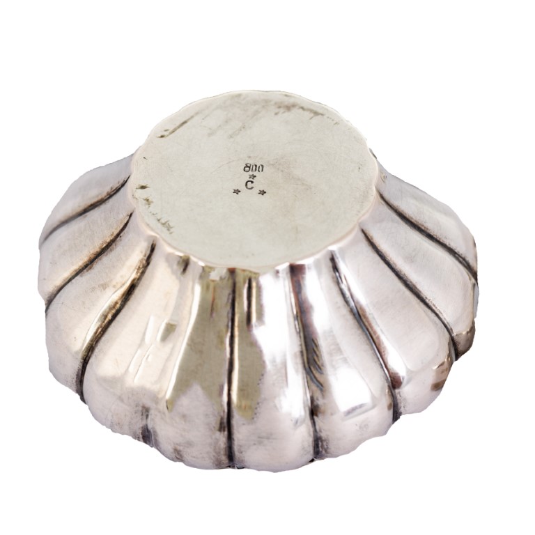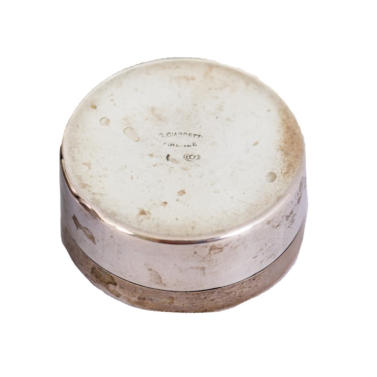 composto da 4 vasetti di forme varie, 1 bomboniera in forma di margherita, 1 scatola circolare con monogramma coronato AL, 5 forchettine da antipasto, 1 alzatina col marchio del negozio Principe, Firenze