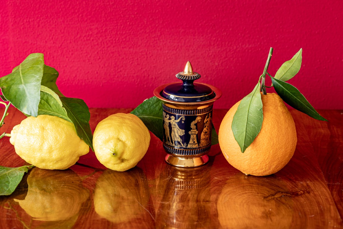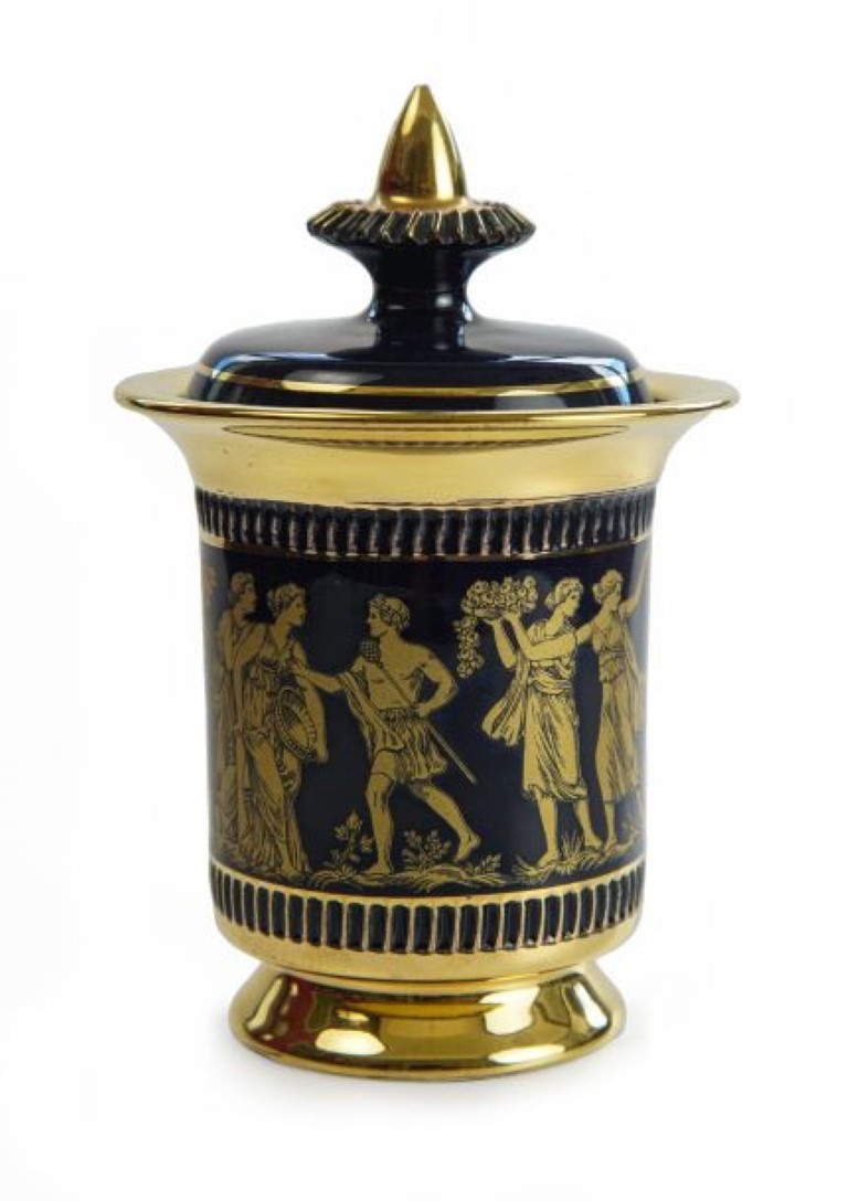 Vaso con coperchio in maiolica blu e oro