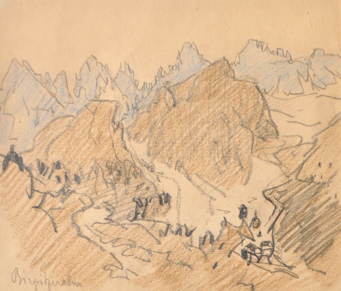 Artur Nikodem (Trient/Trento 1870 - Innsbruck 1940) Malga Birgitzeralm, 1920 ca.;Matita e gessetti colorati, 18 x 21 cm, in cornice