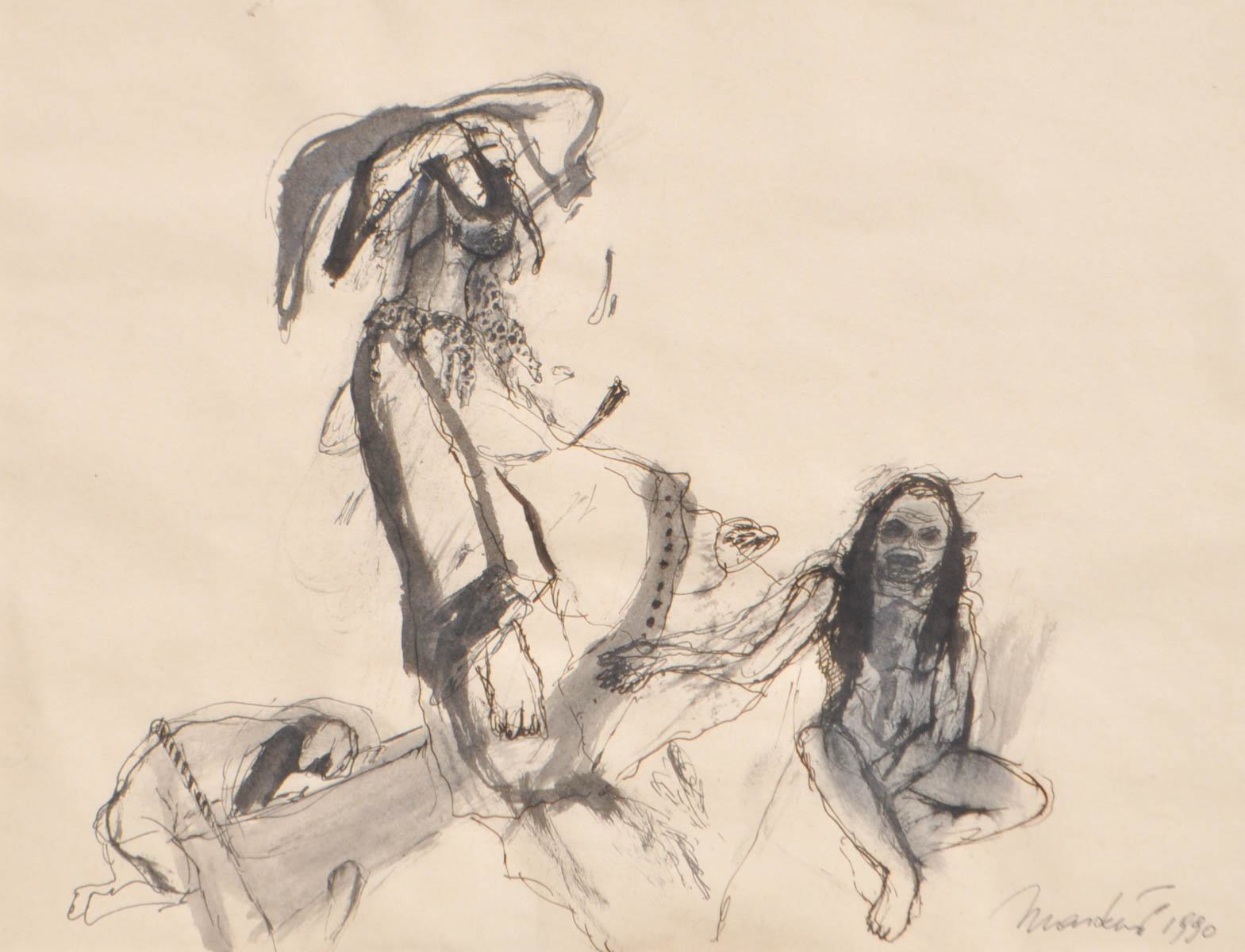 Markus Vallazza (St. Ulrich in Gröden/Ortisei 1936 - Bozen/Bolzano 2019) Gruppo di figure, 1990;China acquerellata, 23,5 x 30,5 cm, in cornice