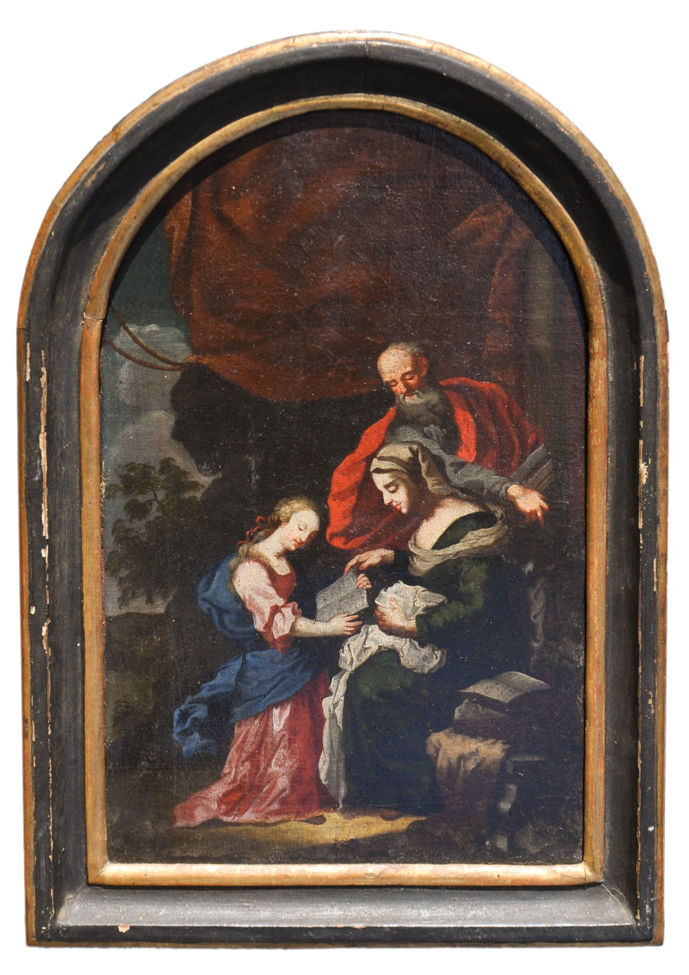 Maler des 18. Jh./Pittore del XVIII sec. Sant’Anna insegna a leggere a Maria Vergine;Olio su tela, 43 x 27,5 cm, restauri, in cornice