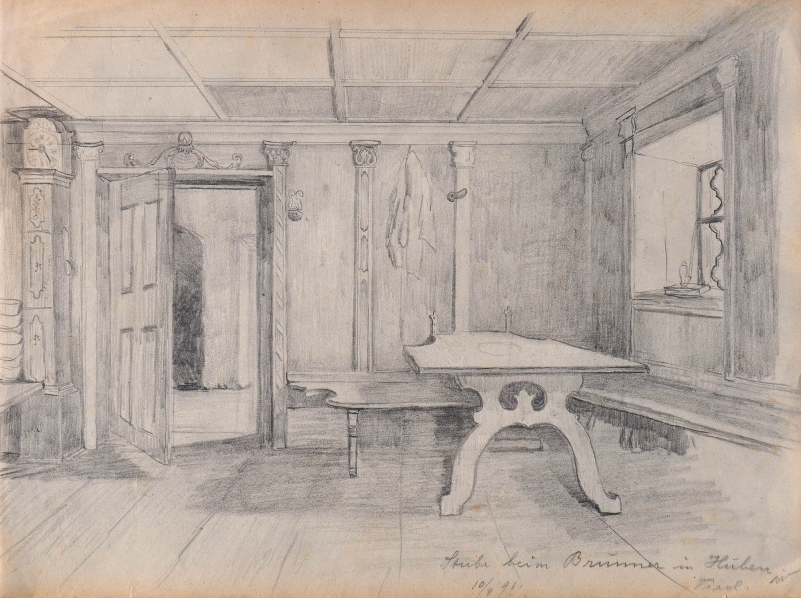Künstler des späten 19. Jh./Artista del tardo XIX sec. Stube presso il Brunner a Huben/valle Ötztal,1891;Matita, 27,2 x 36,2 cm