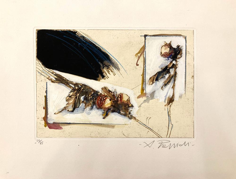 acquaforte-acquatinta e tecnica mista su carta Japon, cm 23,5x33,5, su foglio cm 46,5x55; es. 22/75