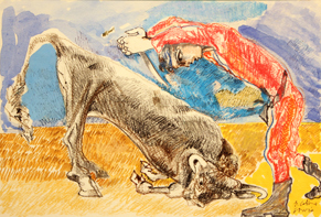 CALABRIA Ennio (Tripoli 1937) Corrida, anni 70 tecnica mista su carta cm. 24.5 x 34.5 Firma 'E. Calabria, Studio' (in basso a destra)