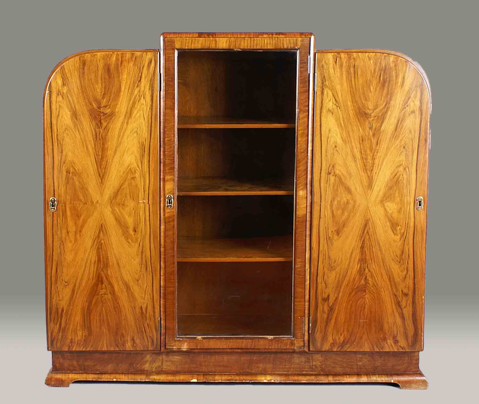 Mobile vetrina Decò in legno di noce di linea mossa, fronte a tre ante di cui...
