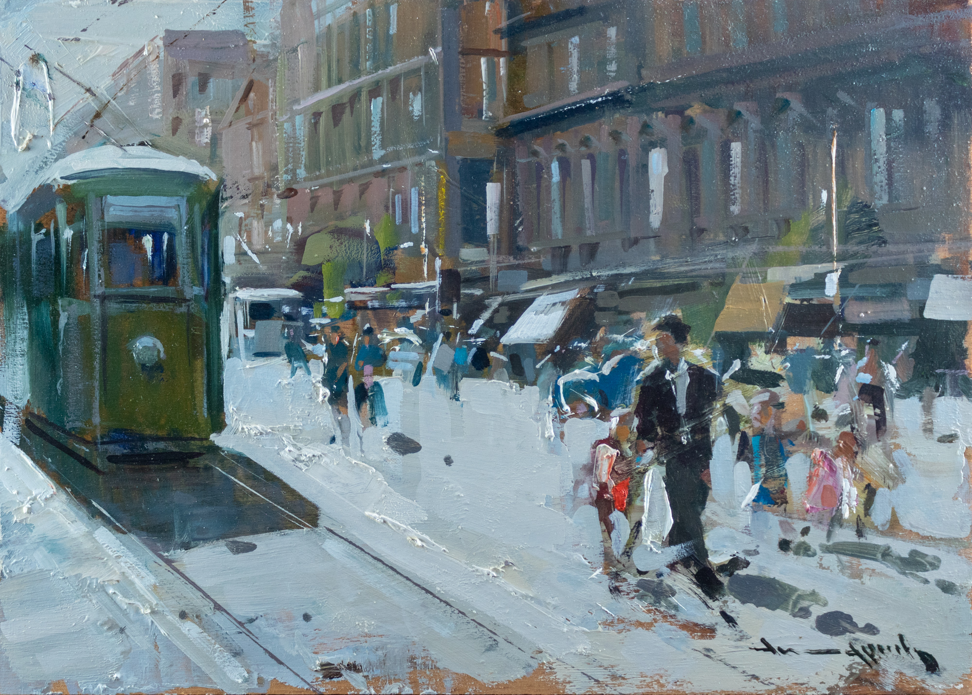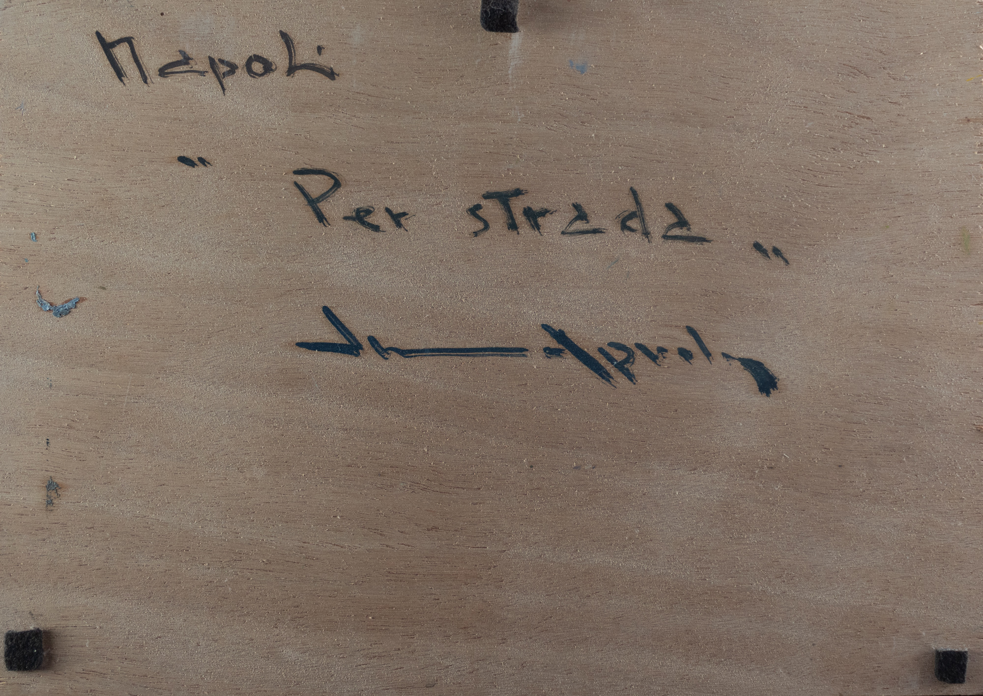 Vincenzo Aprile (Napoli 1952) Per strada, olio su compensato, 25x35 cm
