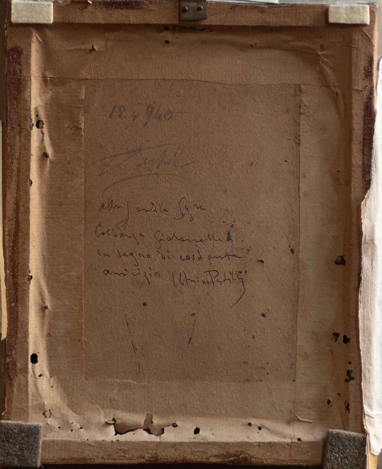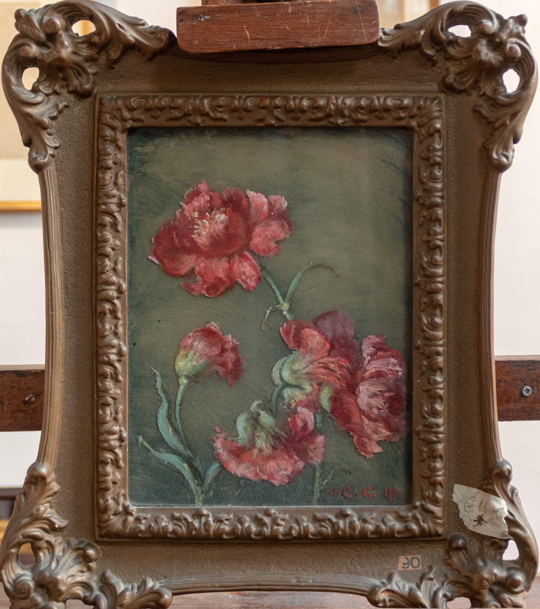 Ulrico Pistilli (Napoli 1854-1950) Garofani rossi, olio su vetro, 22x17 cm, Monogrammato e con dedica "a C.G." in basso a destra