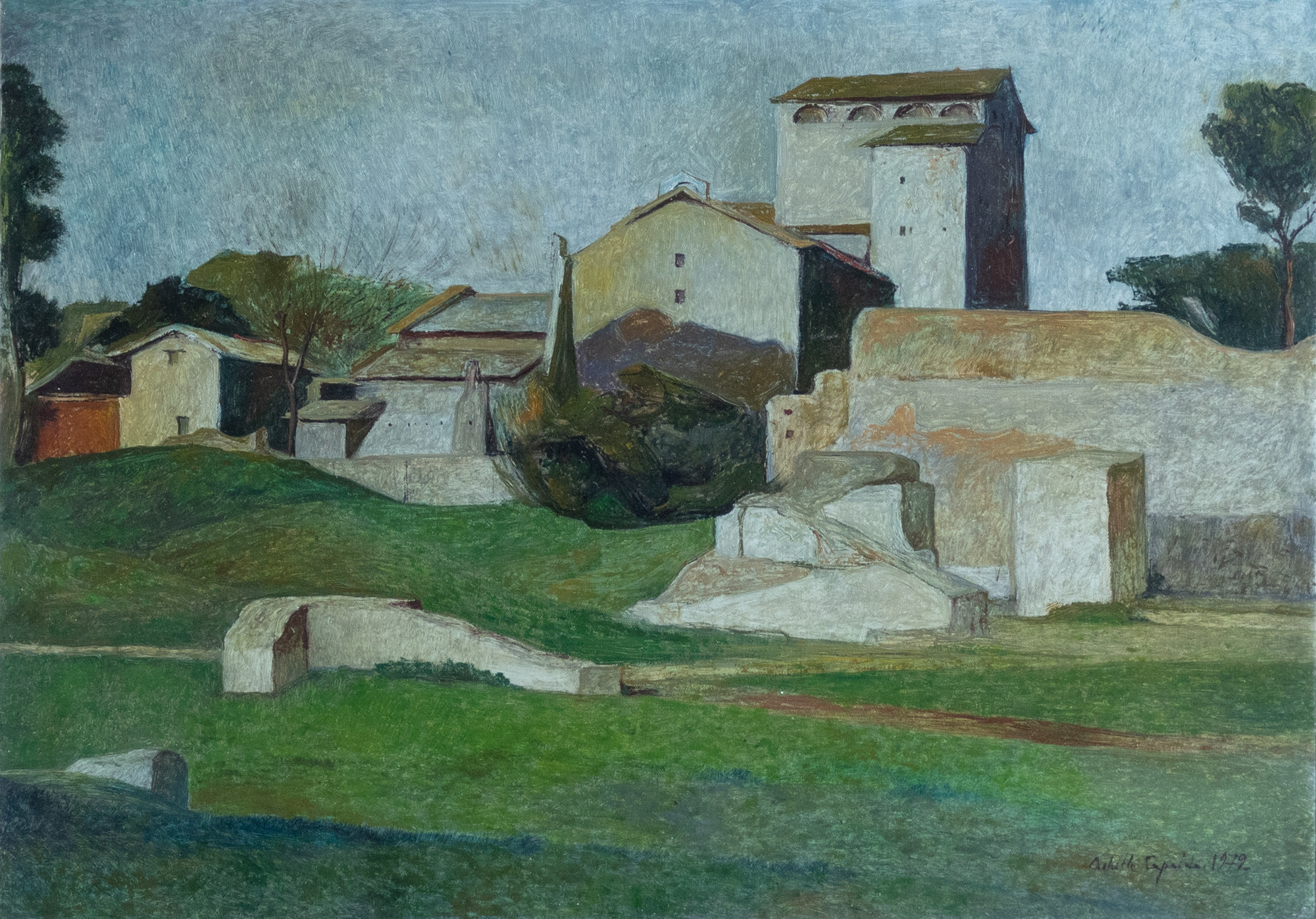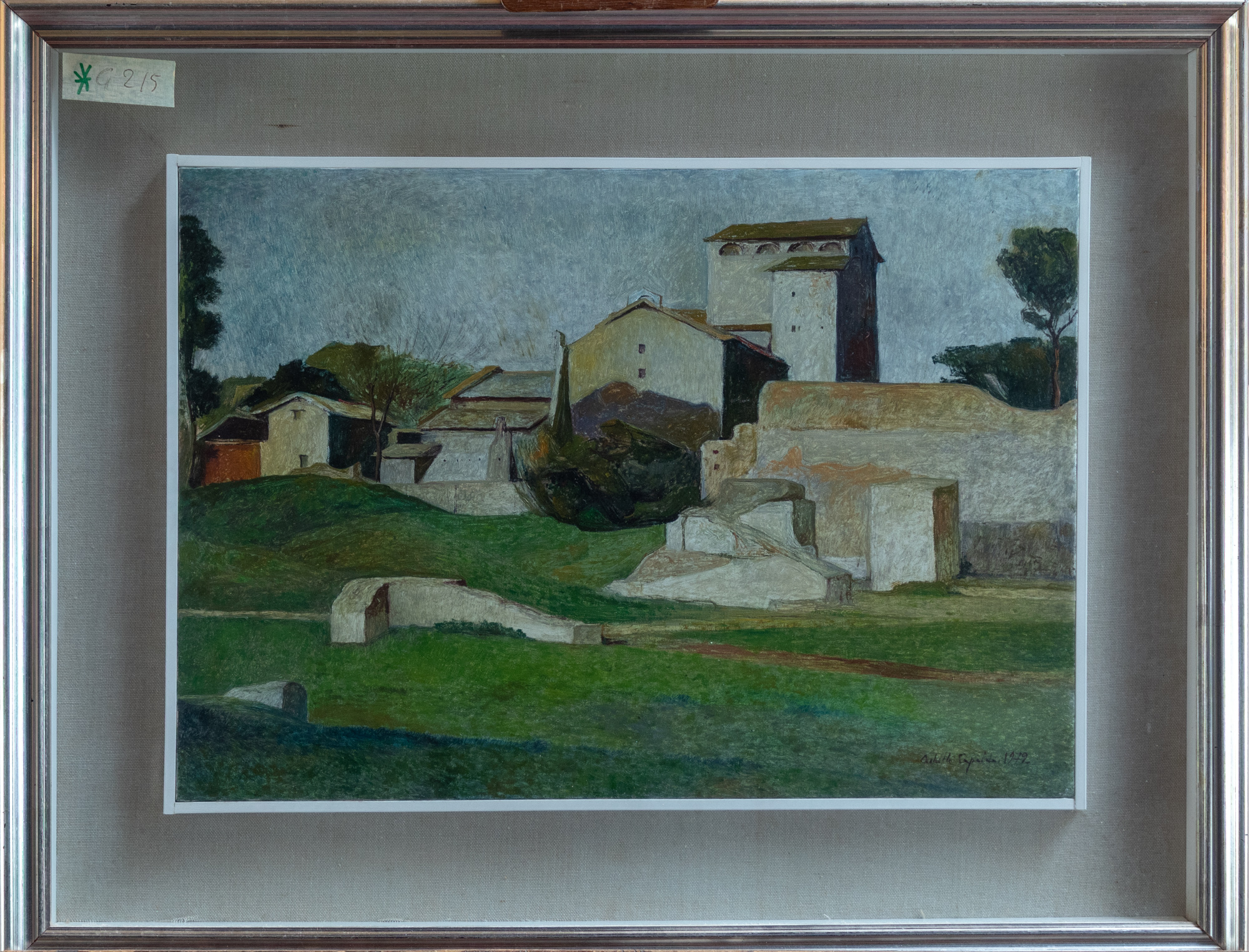 Achille Capaldo (Napoli 1937) Paesaggio con edifici, olio su tela, 36x49 cm, firmato e datato in basso a destra '1972'
