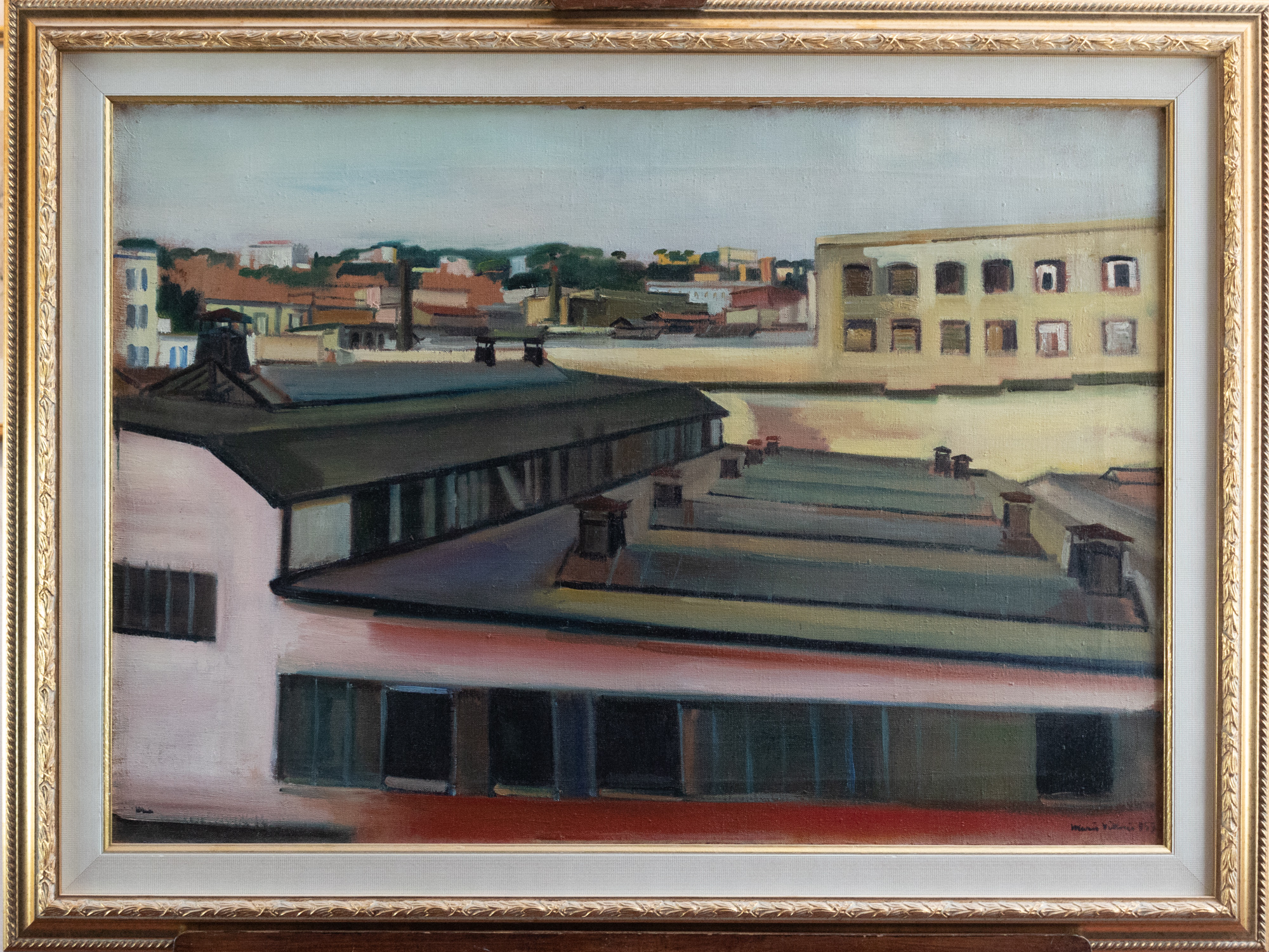 Mario Vittorio (Napoli 1908 - 1975) Veduta cittadina con fabbrica, olio su tela, 57x81 cm, firmato e datato in basso a destra '(1)959'