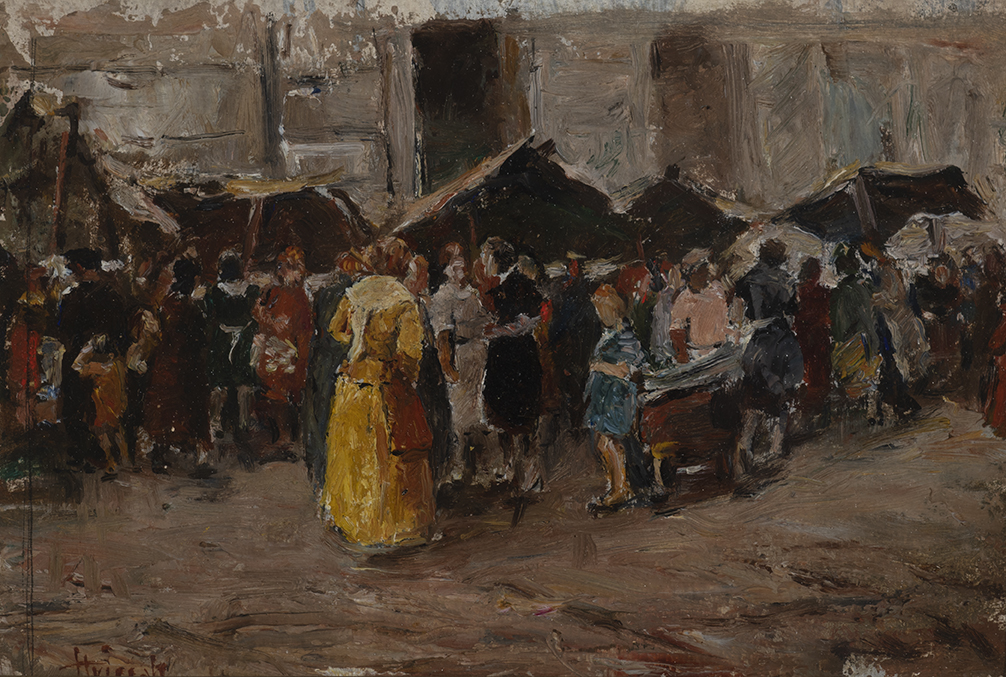 Carlo striccoli (Altamura 1897 - Arezzo 1980) Scena di mercato, olio su tavoletta, 17x23 cm