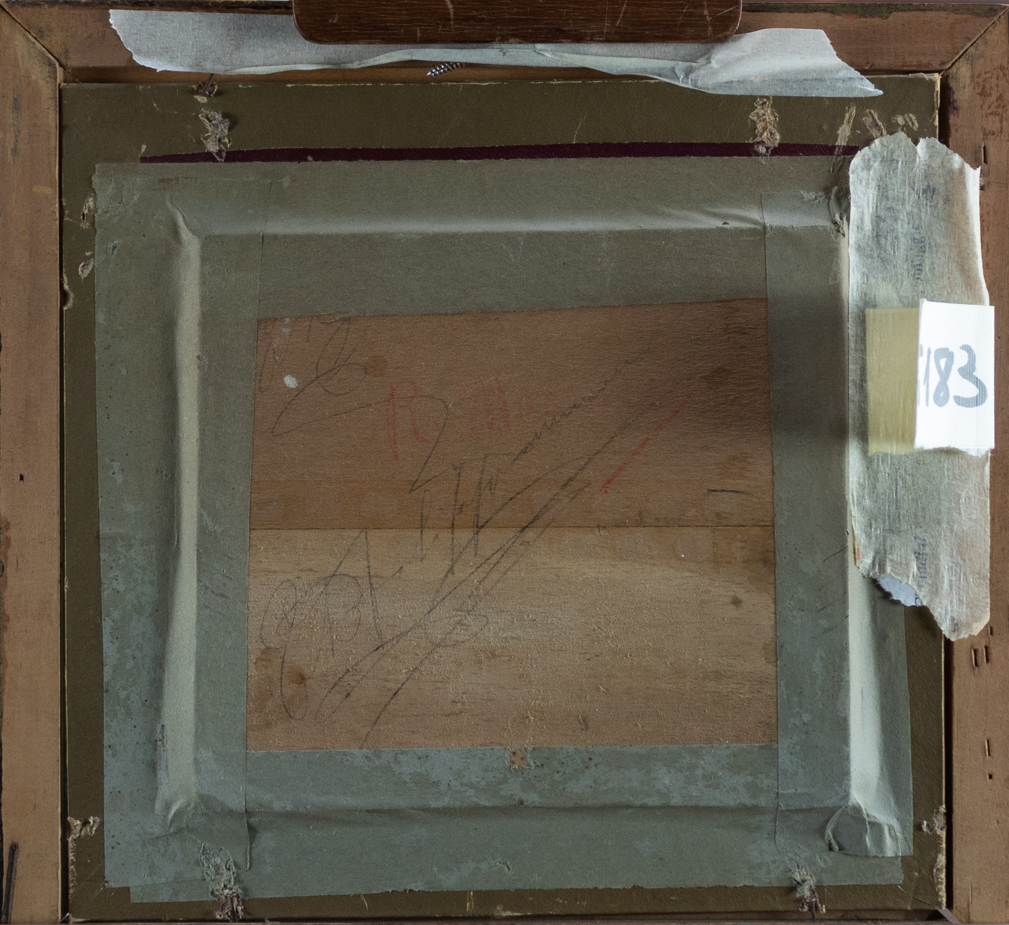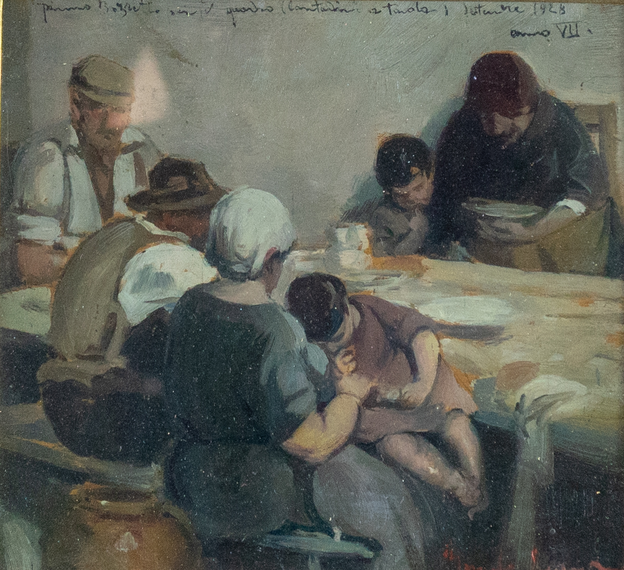 Romolo Leone (Napoli 1883 - 1958) Contadini a tavola, olio su tavola, 15x17 cm