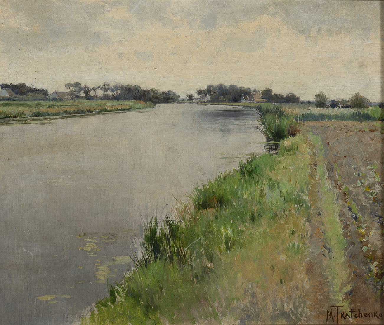 Mikhail Stepanovich Tkatchenko (1860-1919) Lungo il fiume, olio su tavola, 27,5x34,5 cm