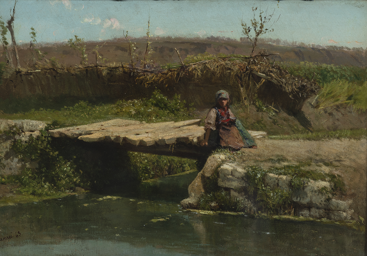Francesco Mancini (detto Lord) (Napoli 1830 - 1905) Contadinella presso il ponticello, olio su tela 25,5x38,5 cm, firmato e datato in basso a sinistra '(18)49'