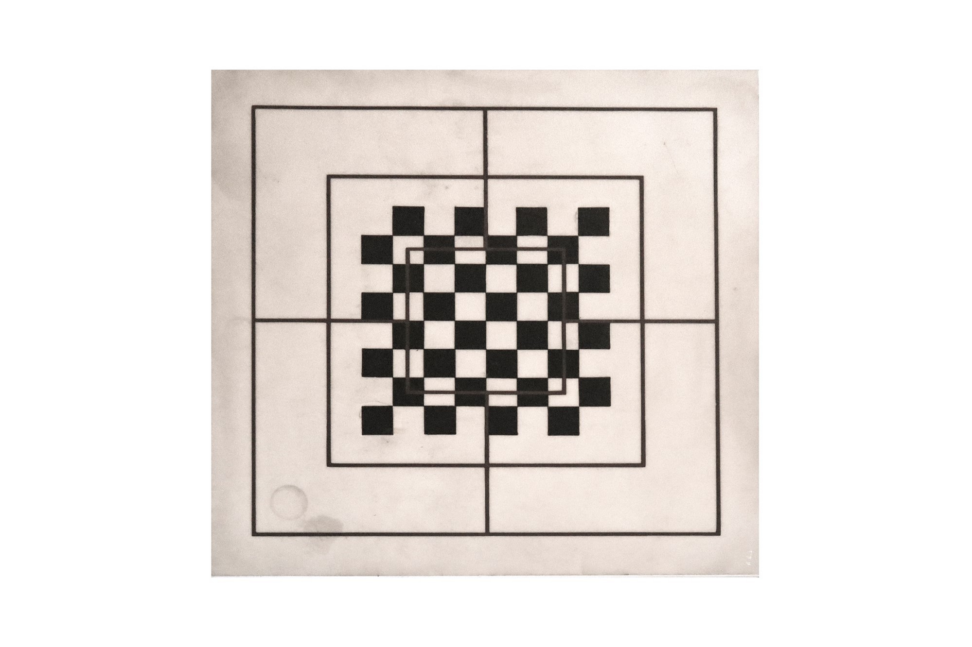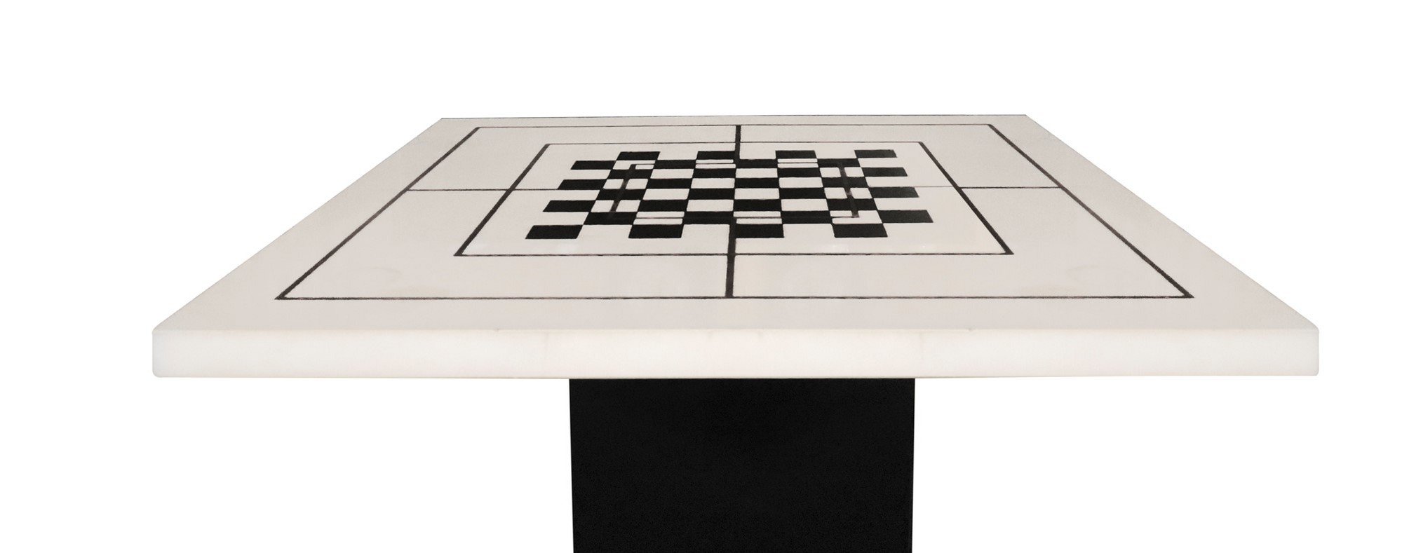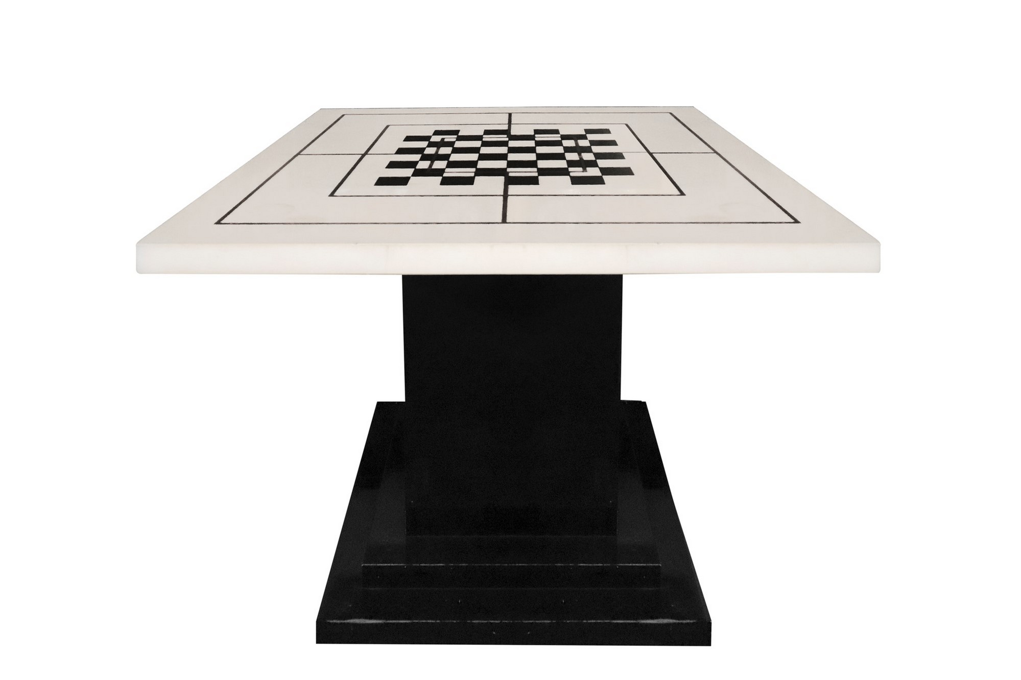 Tavolo quadrato cm 66 x cm 90 x cm 90 Base in legno laccato nero, piano al marmo con scacchiera dipinta.Base in legno laccato nero, piano al marmo con scacchiera dipinta.