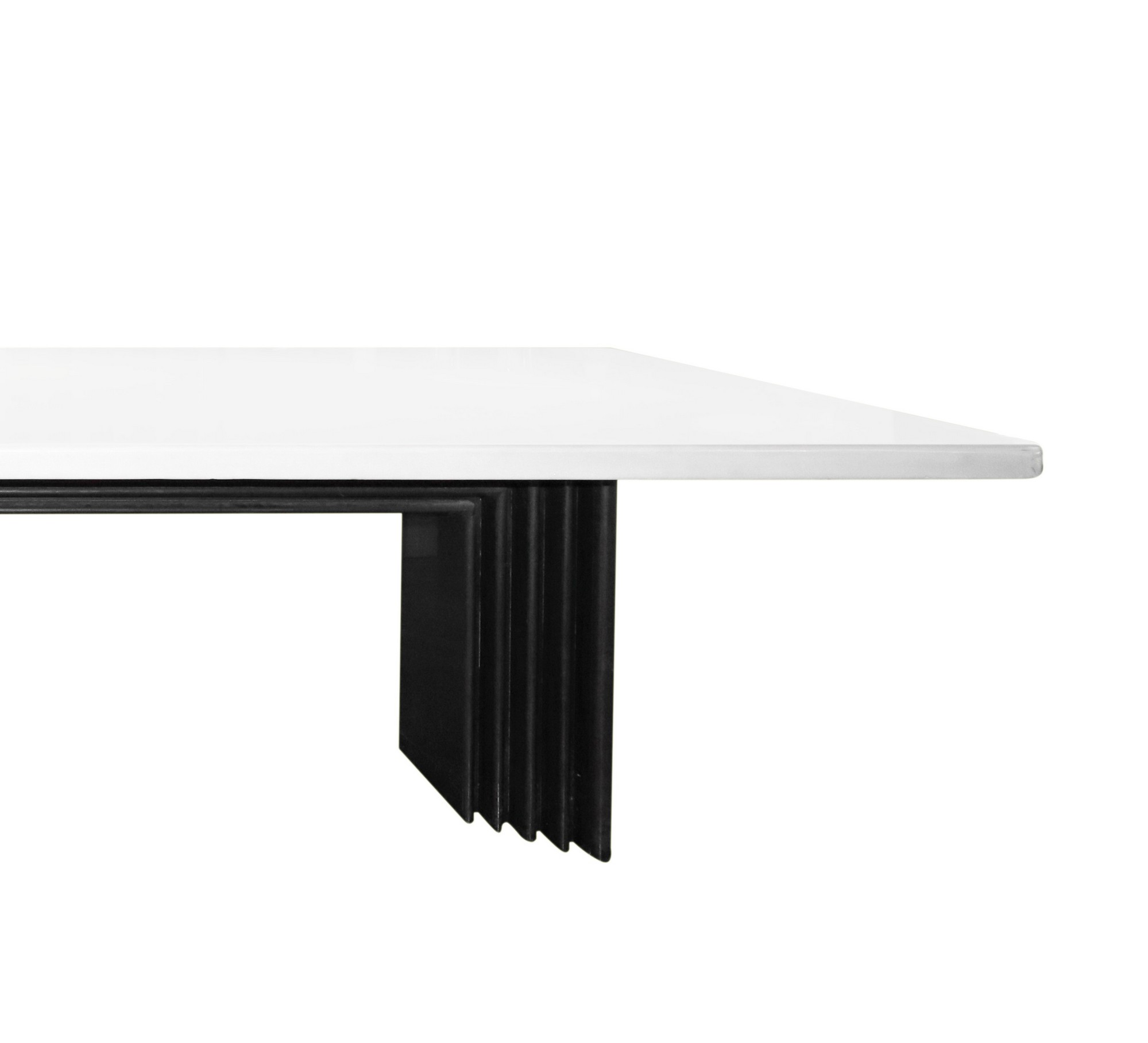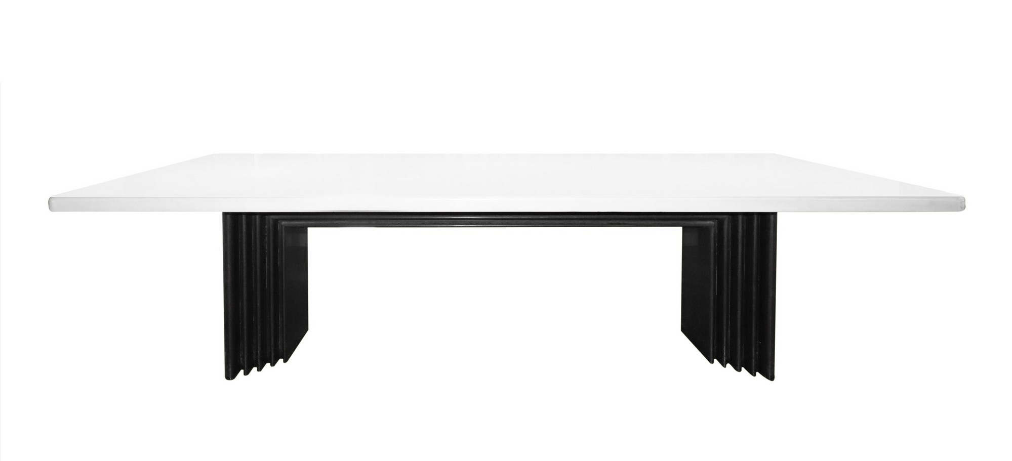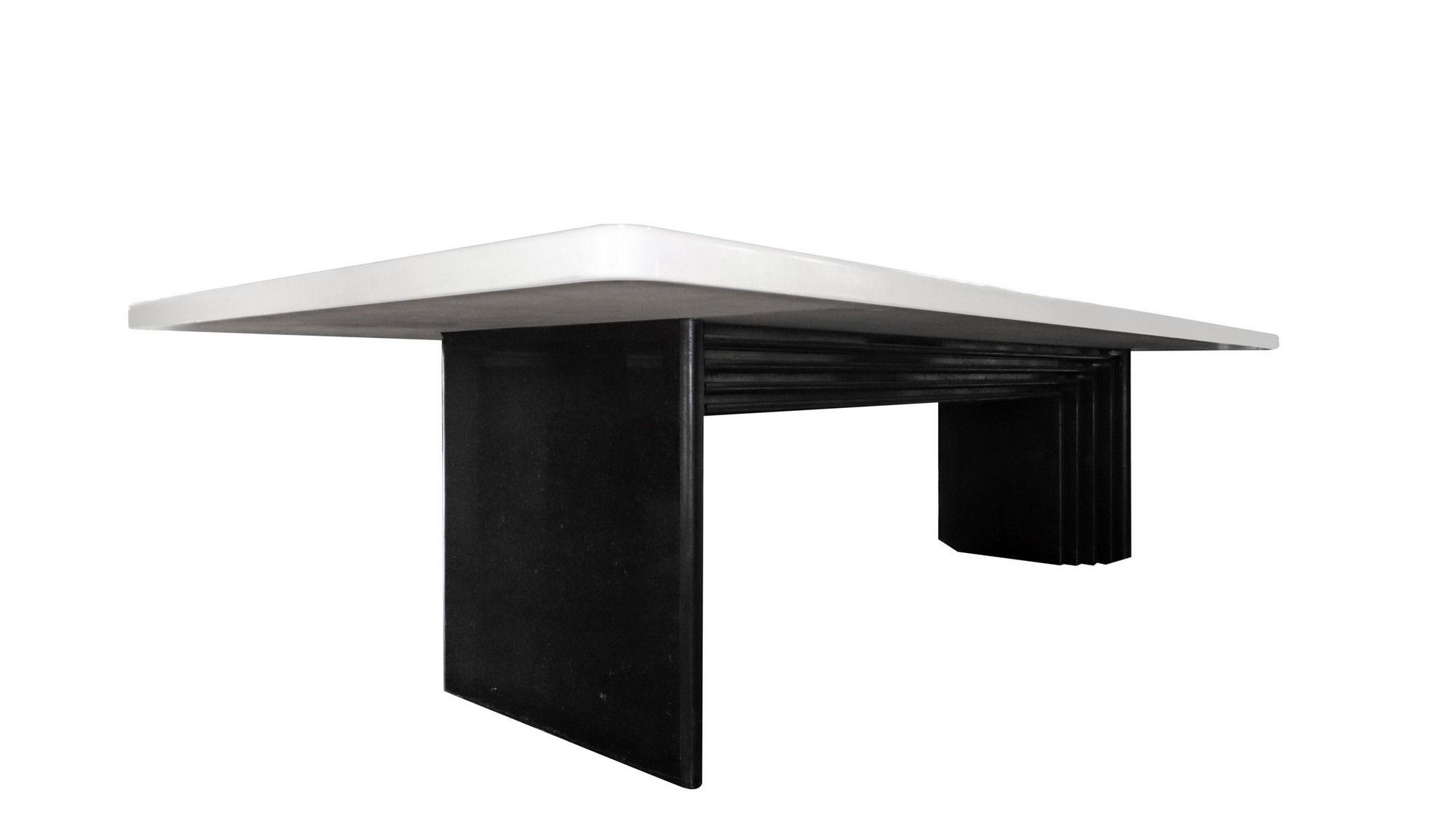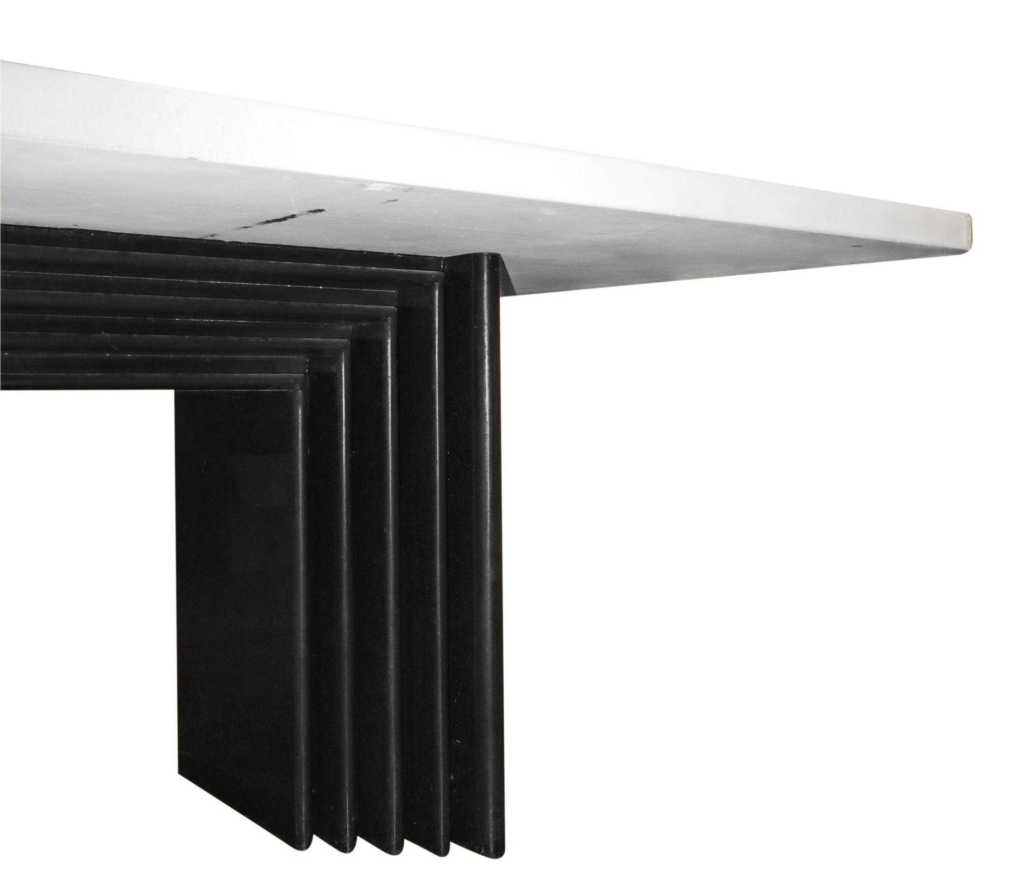 Importante tavolo scultorio da riunione realizzato per una committenza privata attr. a Carlo Scarpa. Piano in marmo bianco id Grecia rettangolare e bordi stondati. Piedi monolitici in marmo nero assoluto del Belgio riportante modanature degradanti con bordi stondati e raccordati da elemento anch’esso n marmo nero assoluto riportante lo stesso motivo. Tavolo, quale elemento di arredo evocativo delle progettazioni razionaliste degli anni ’30, di grande impatto estetico.