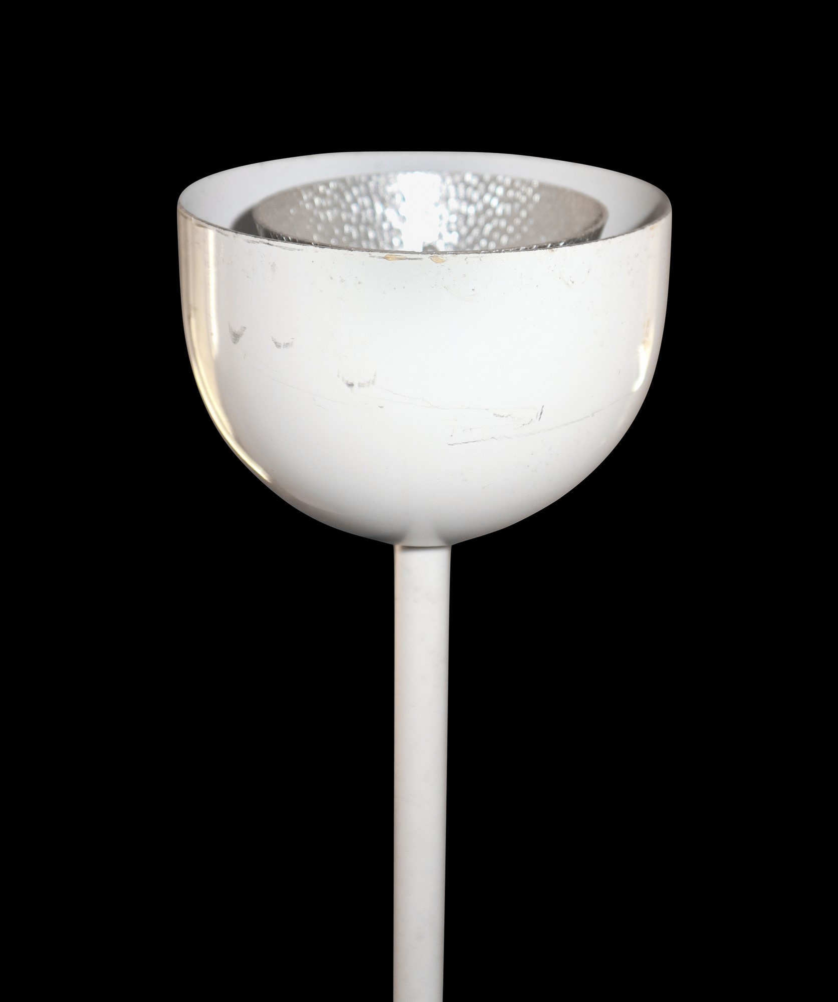 Lumi Milano - Piantana a stelo laccata bianco, 70's h cm 183 Struttura in metallo laccato nei toni del bianco. Illuminazione alogena. Segni di uso, salti di smalto alla base.Struttura in metallo laccato nei toni del bianco. Illuminazione alogena. Segni di uso, salti di smalto alla base.