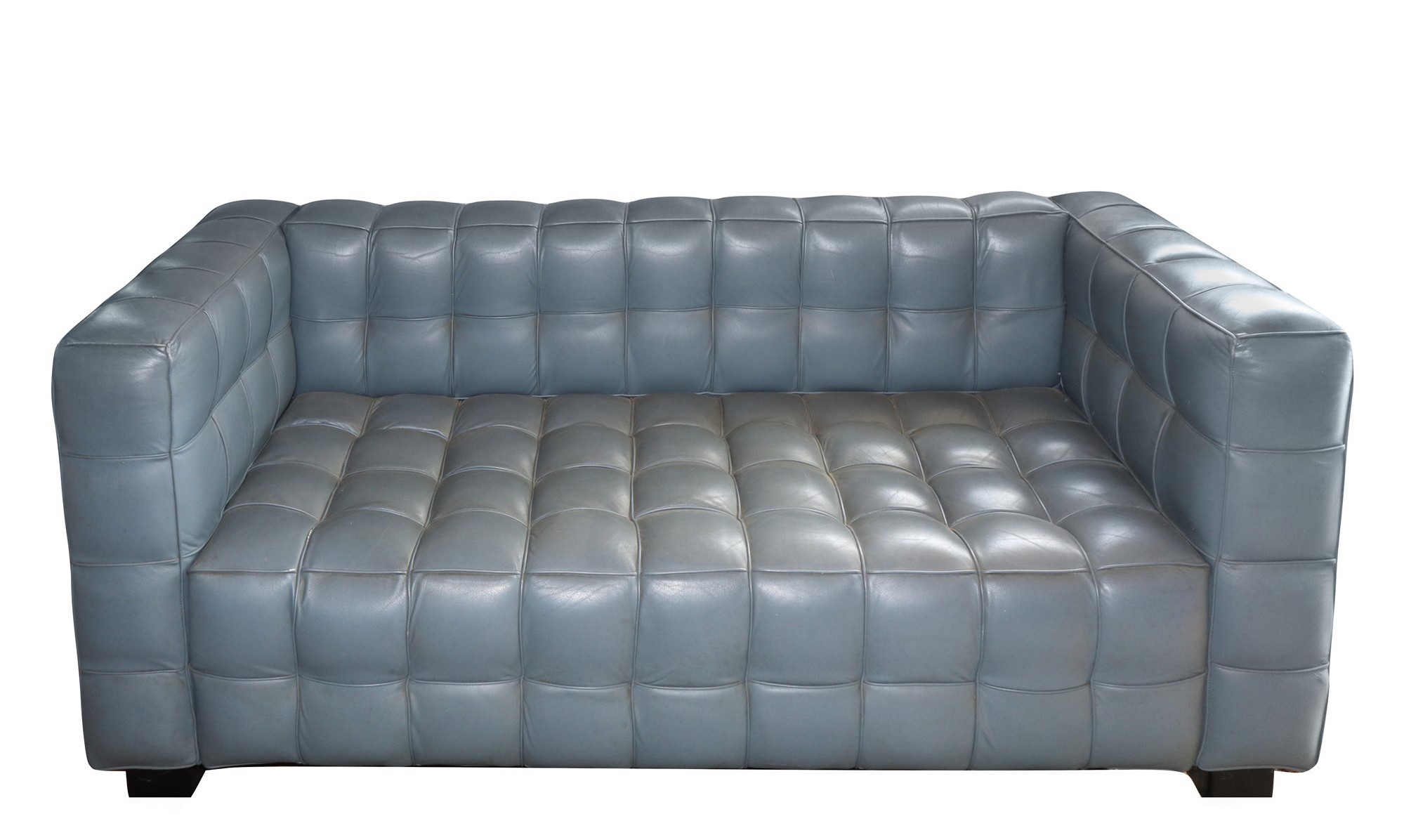 Divano e poltrona modello Kubus, prod. italiana, nello stile di Joseph Hoffmann, Late 60s divano h cm 73 x cm 164 x cm 72; poltrona h cm 73 x cm 93 x cm 78 Struttura in legno rivestita in pelle primo fiore color azzurro.Struttura in legno rivestita in pelle primo fiore color azzurro.