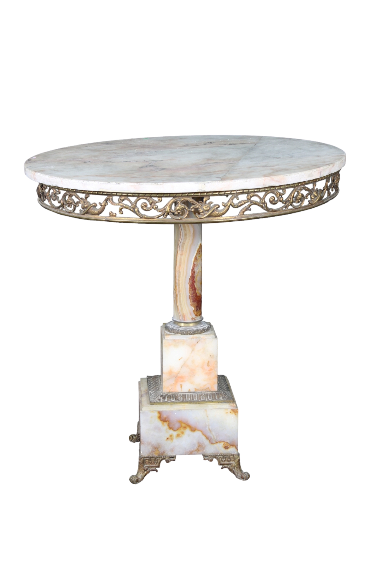 TAVOLINO DA CENTRO di forma circolare in onice e bronzo cesellato e dorato Francia XIX- XX secolo h cm 75 x 73