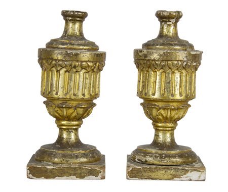 COPPIA DI PIGNE PORTA PALME in legno finemente scolpite e dorate ad argento e mecca Sicilia XVIII secolo