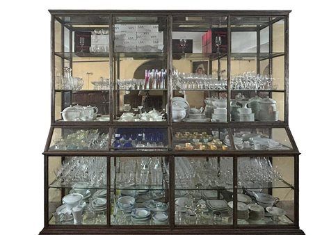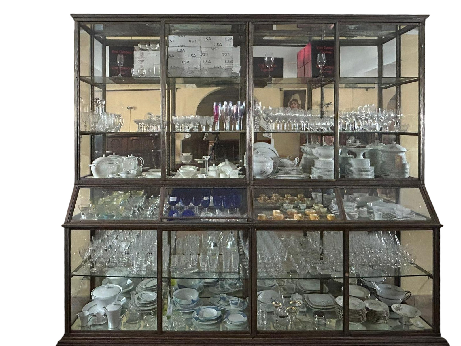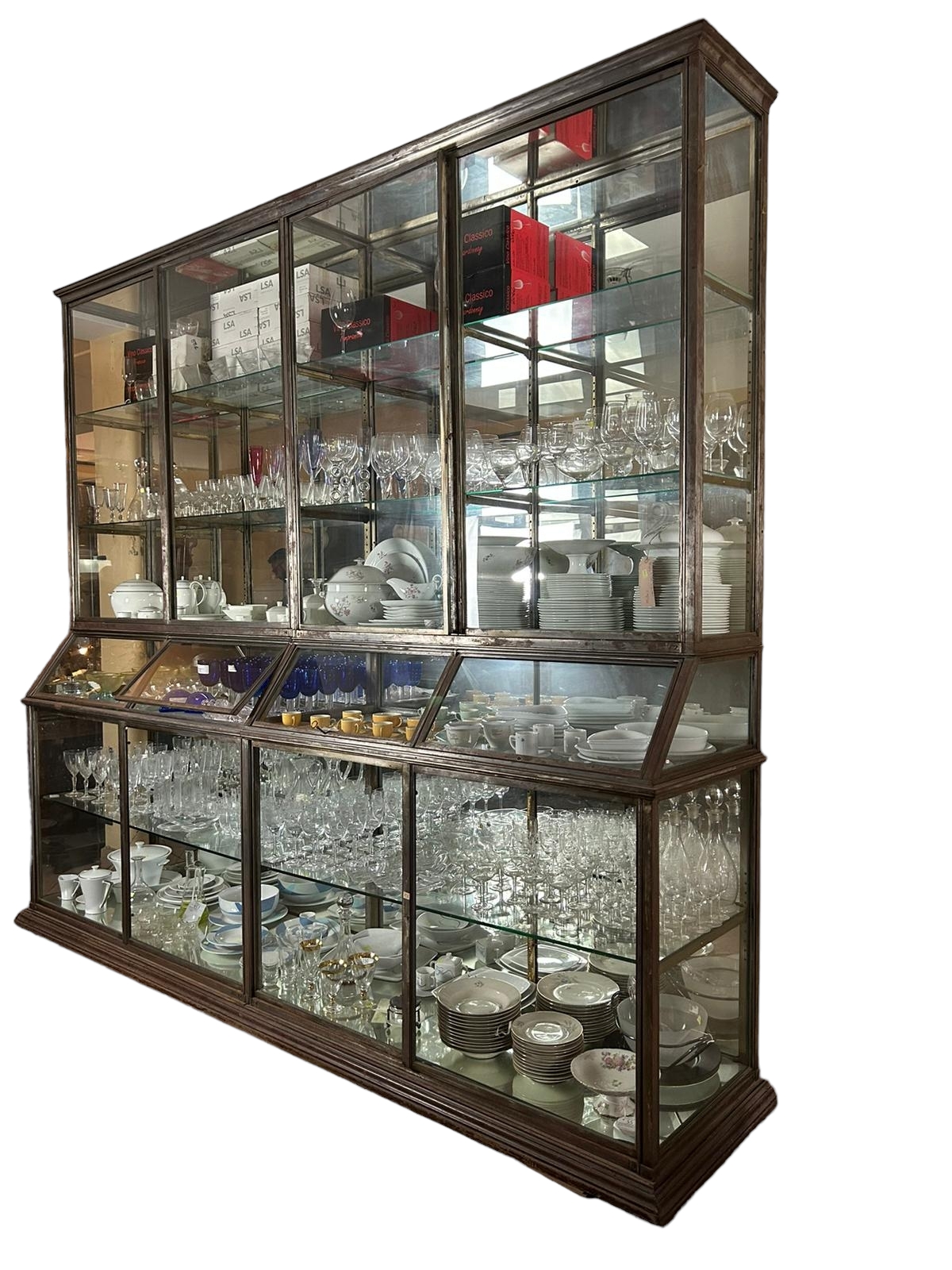 GRANDE VETRINA in acciaio e vetro con base in legno scorniciata a 4 ante maestranze italiane XIX- XX secolo h cm 273 x 304 x 66