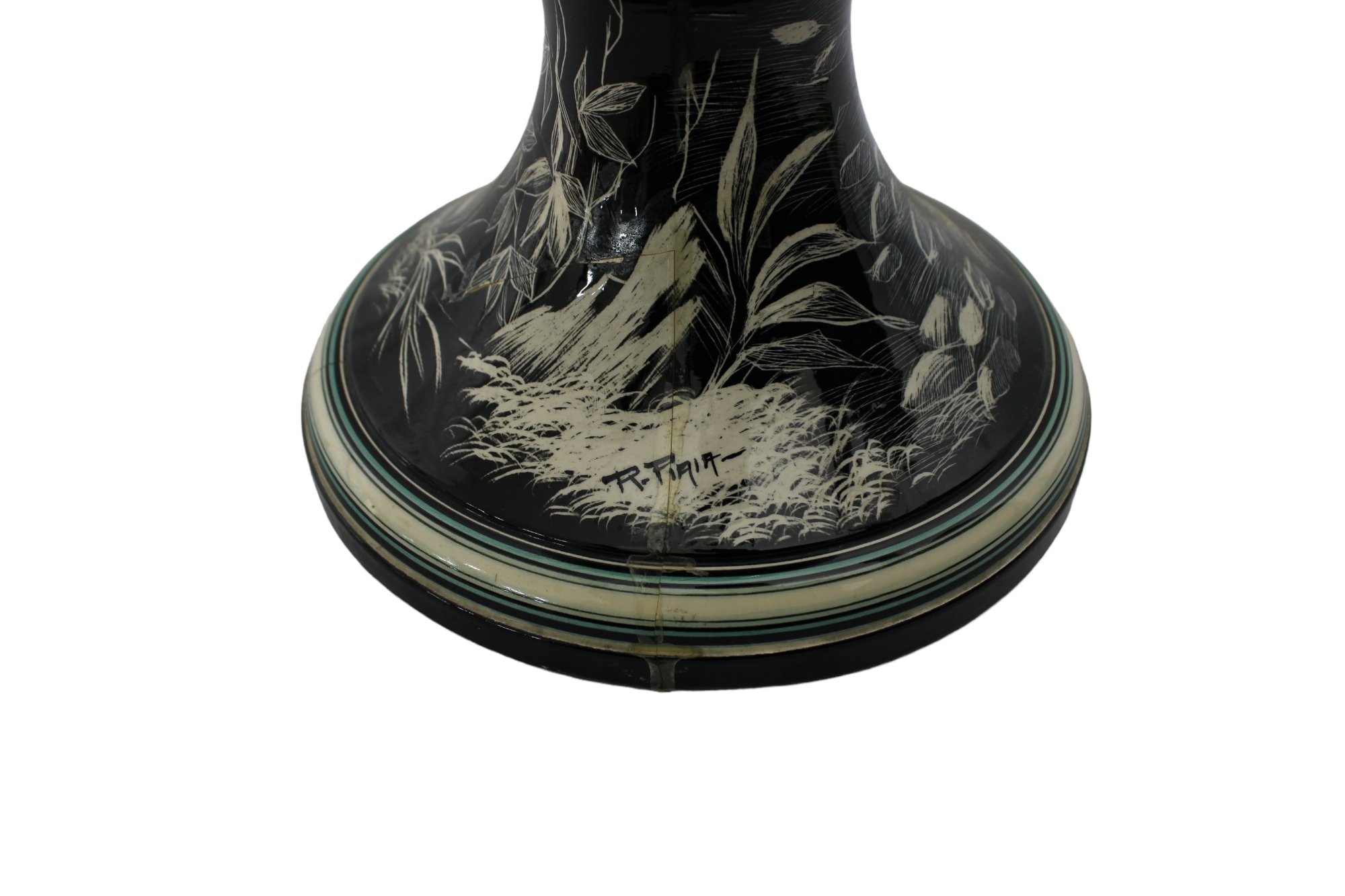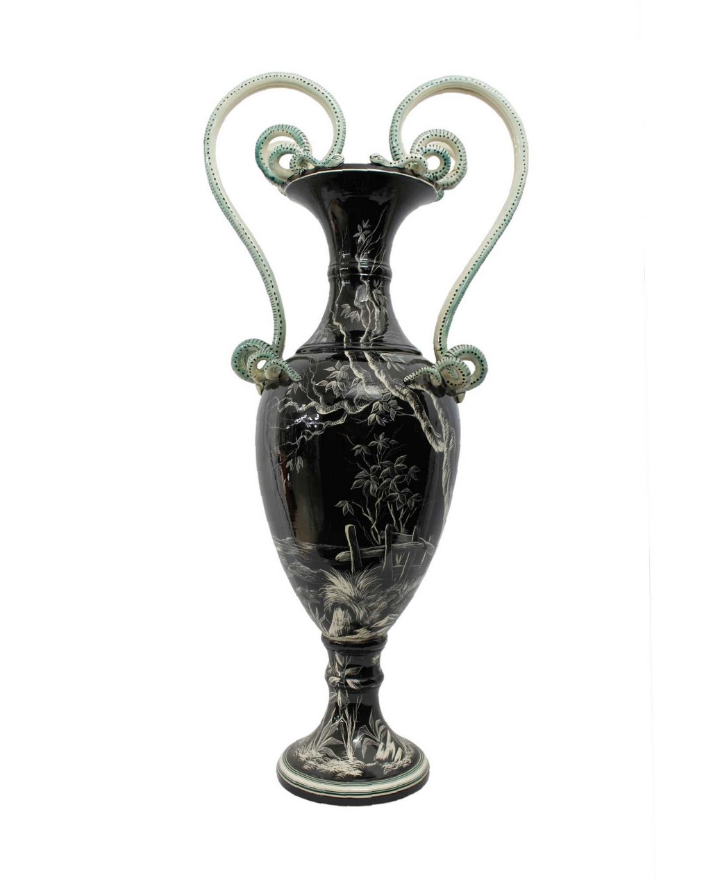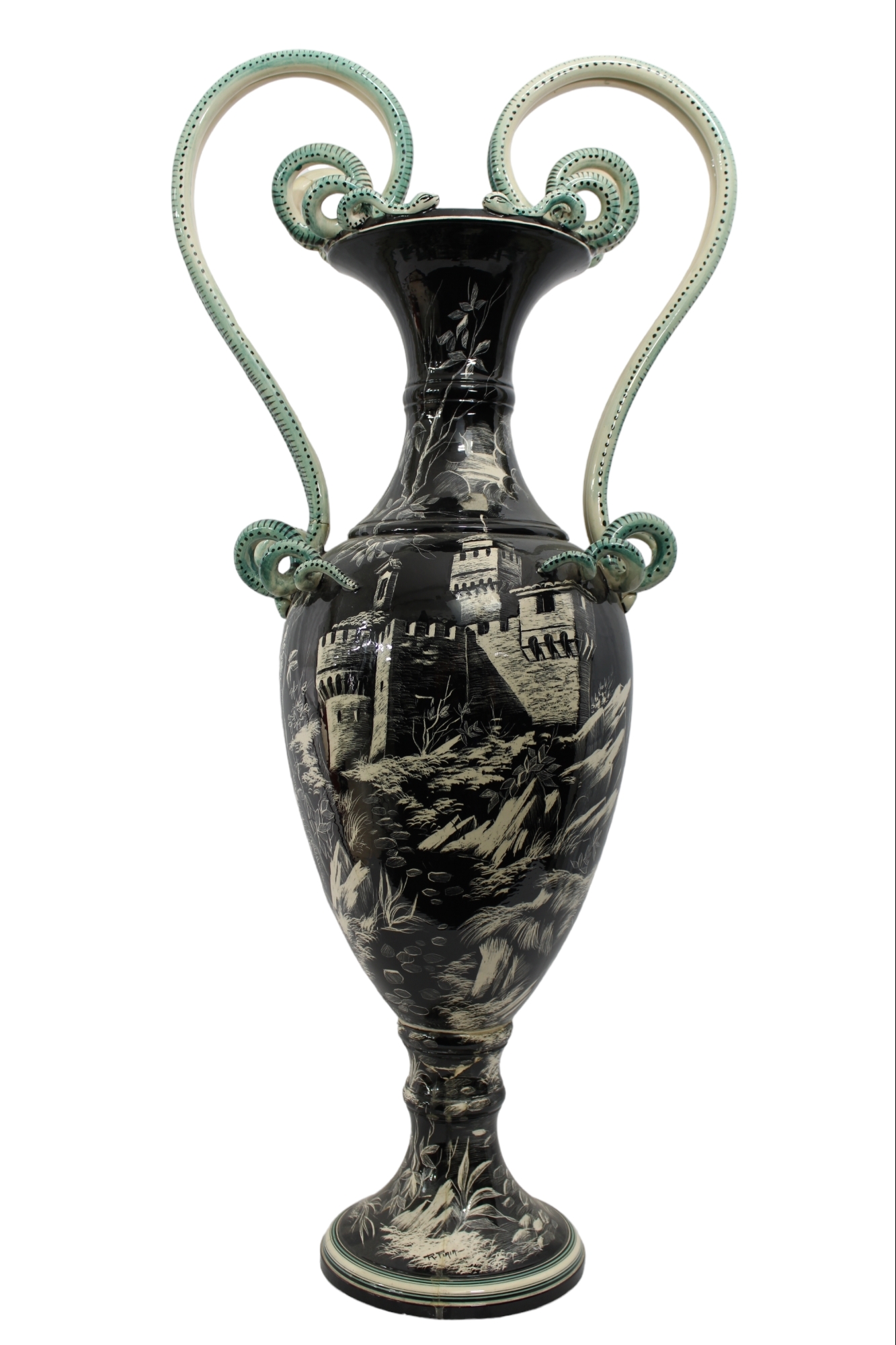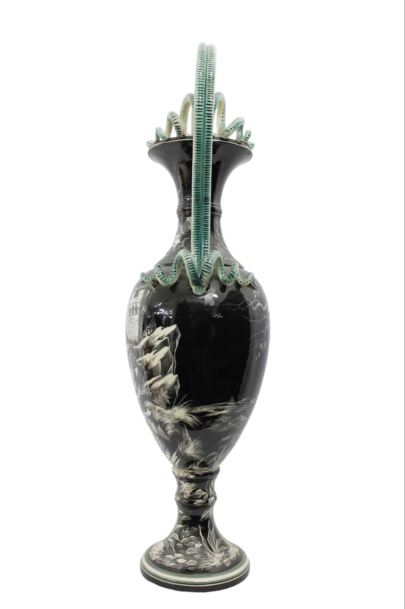 GRANDE VASO D FORMA OVOIDALE in porcellana decorata da paesaggio con castello su fondo nero, anse e guisa di serpente sbeccature XIX secolo Italia h cm 102 x 48 x 30