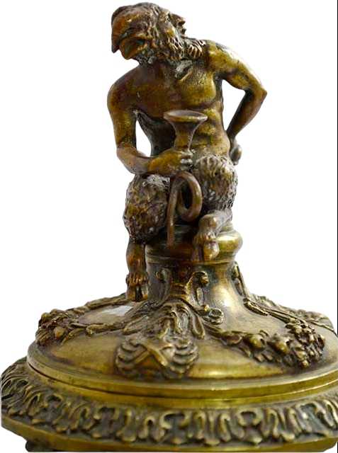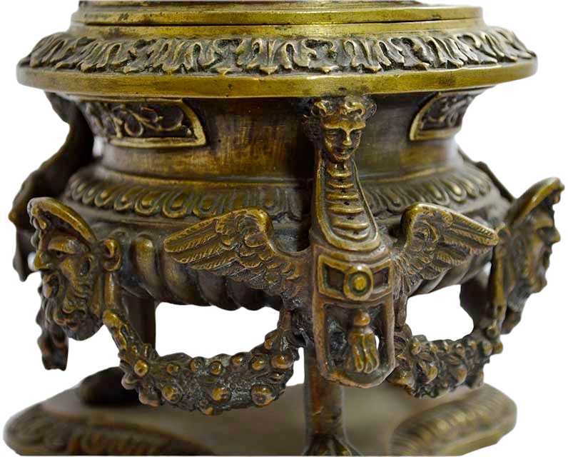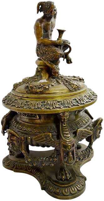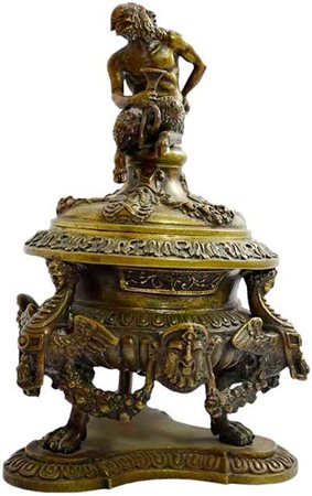 CALAMAIERA in bronzo marcata A. Pandiani 1838-1926, riccamente cesellata, contenitore a forma di vaso decorata da dragoni e festoni tenuti da mascheroni, poggia su piedi felini, con base trilobata coperchio con presa raffigurante satiro fine 800 Italia h cm 19 x 14