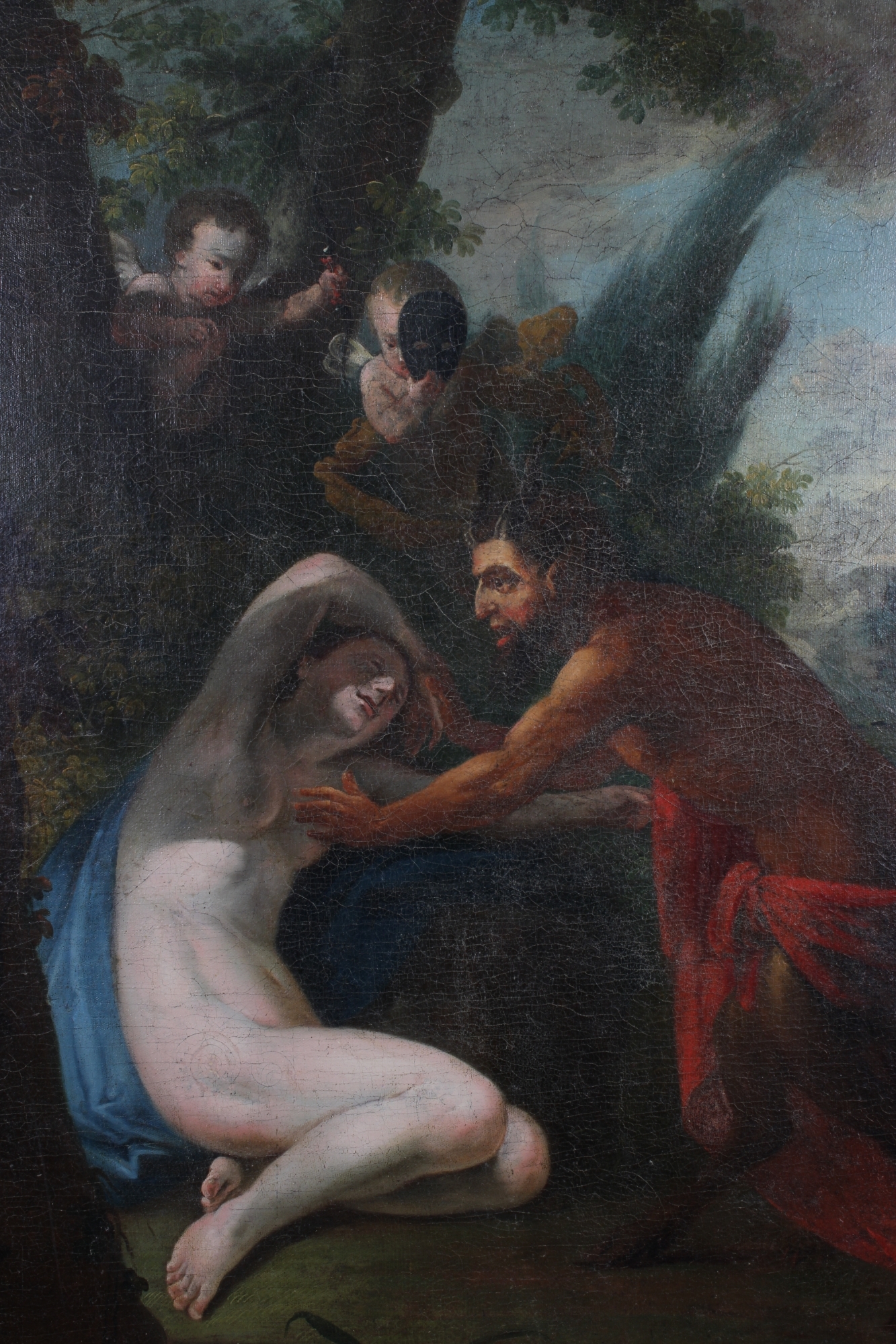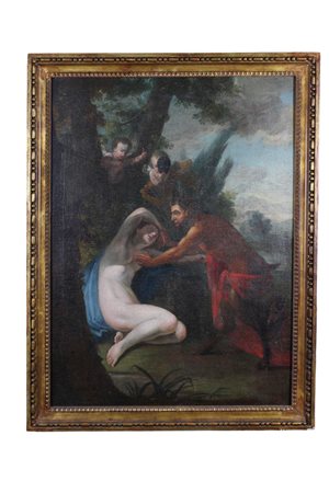 OLIO SU TELA Raffigurante Scena Mitologica, con cornice in legno dorato scuola francese XVIII secolo h cm 108x 80 / cornice h cm 117 x 89