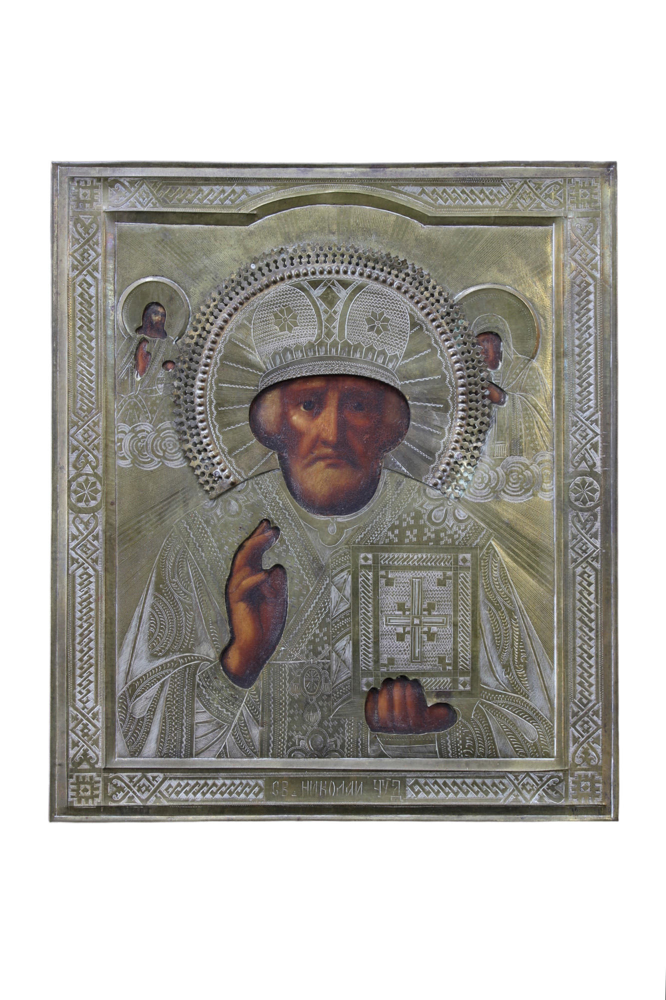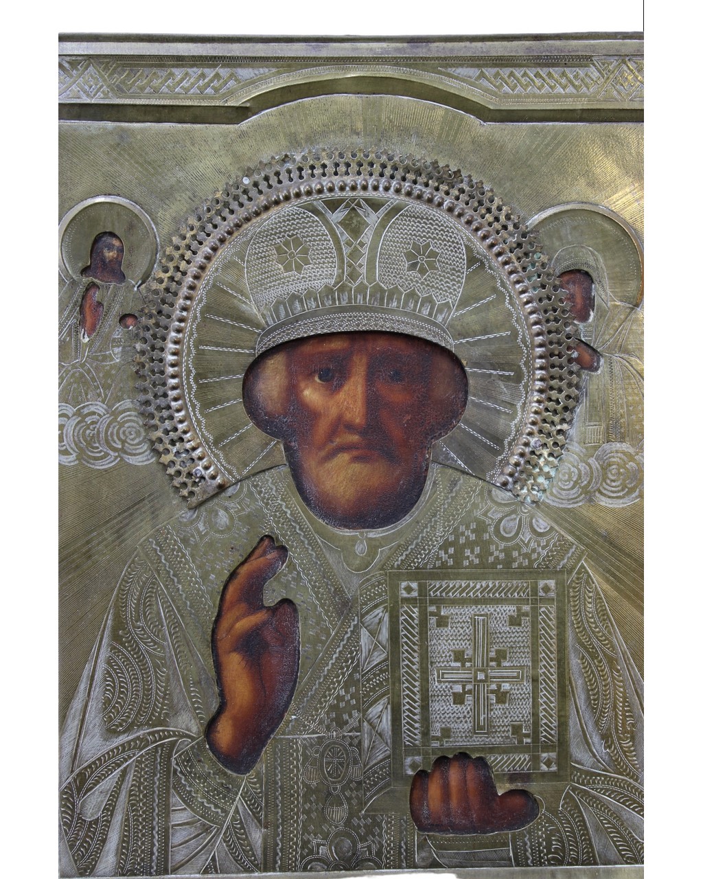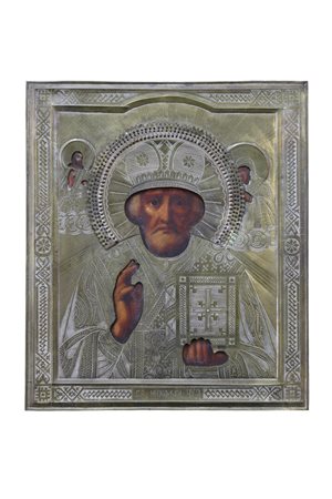 ICONA Raffigurante San Nicola con rizza in metallo dorato manifattura Baltica XIX secolo h cm 31,5 x 27