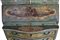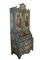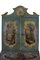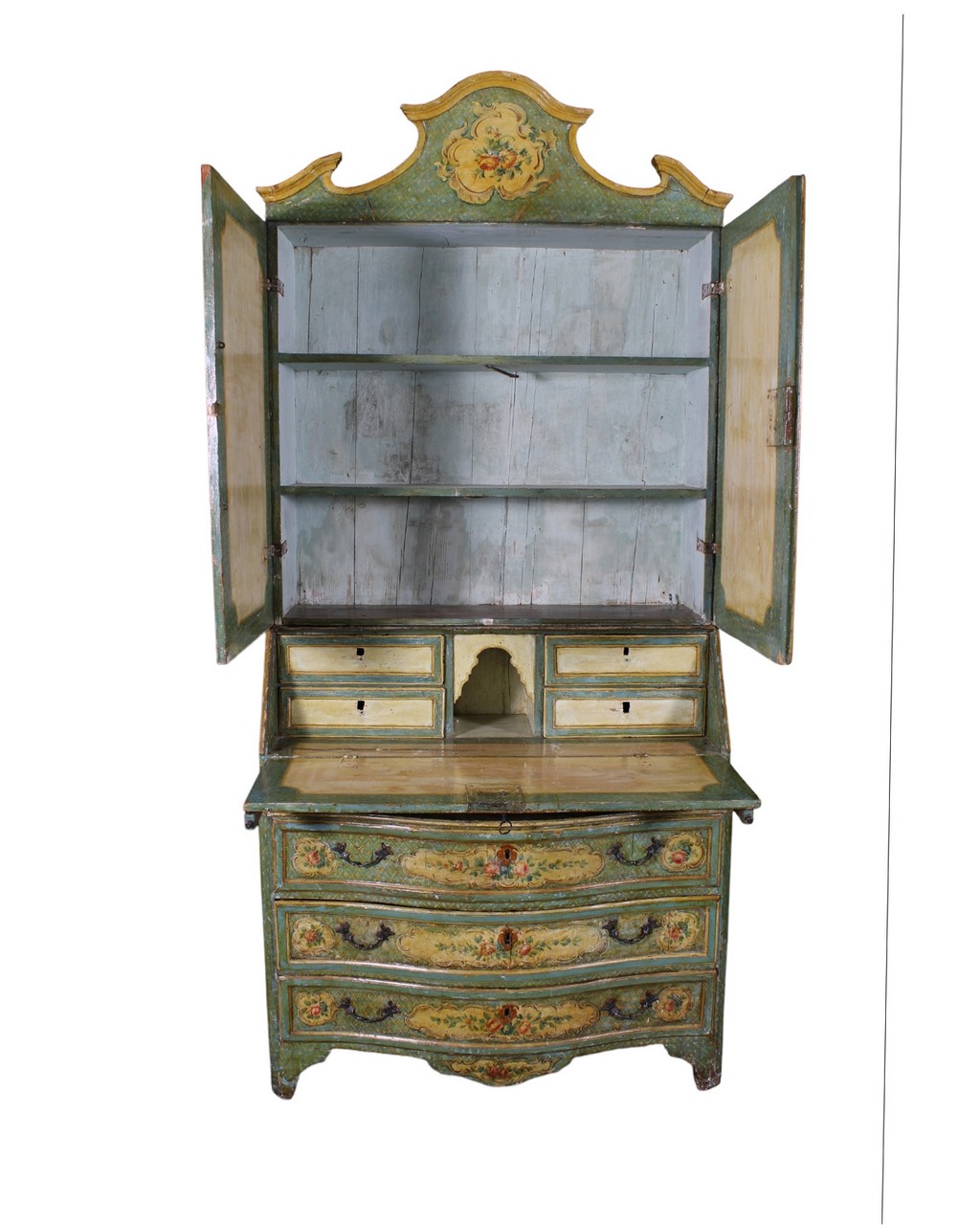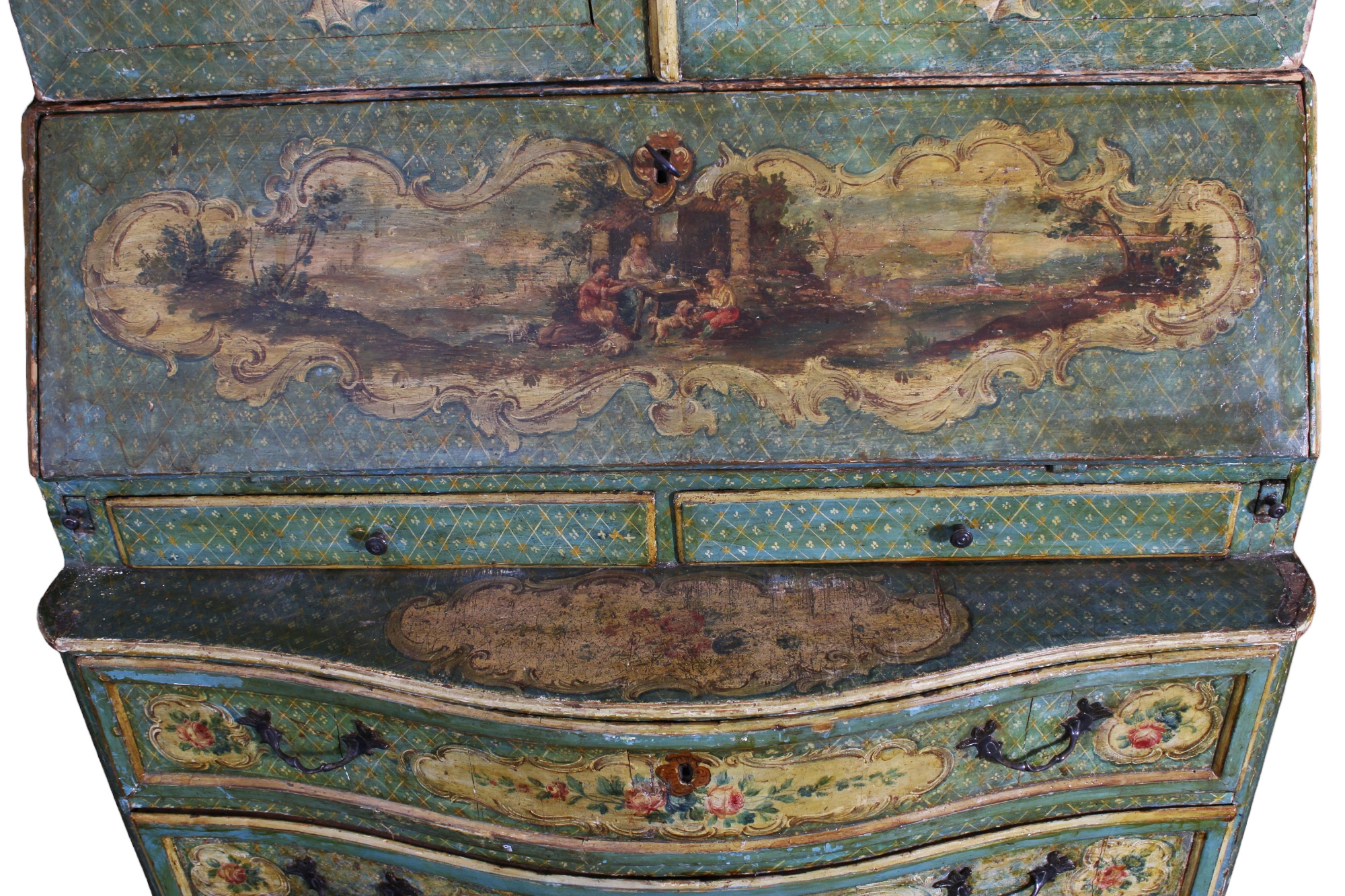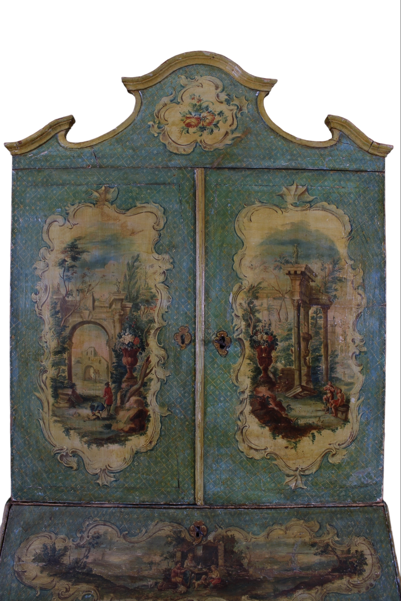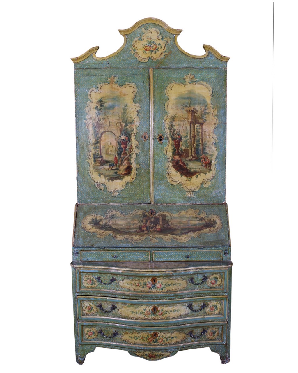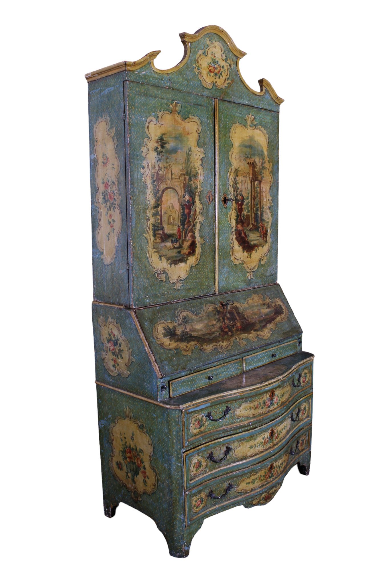 TRUMEAU SICILIANO con struttura in abete, laccato e finemente dipinto con motivi floreali entro riserve, sia nei cassetti che sui laterali,mentre sul fronte mostra tre dipinti con scene di paesaggi, rovine e personaggi. Lo sfondo è realizzato ad alveare fiorito, con piccoli decori di fiorellini entro un fitto reticolo a piccoli rombi. Questo mobile, che è fortemente influenzato dalla ebanisteria veneziana del 700, ne differisce proprio per questa particolare e delicata quadrettatura fiorita. Una vecchia patina giallastra facilmente asportabile, cambia la colorazione originaria "azzurro carta da zucchero" rendendola verde, ma ne ha conservata quasi integralmente la pittura originaria. h cm 247 x 112 x 65