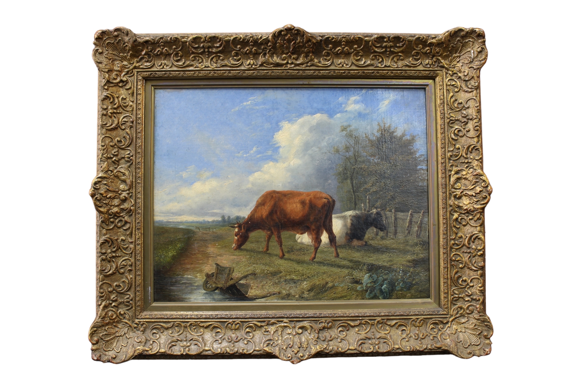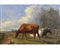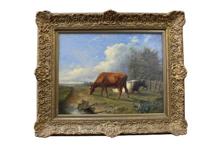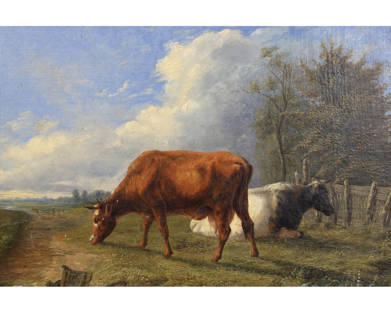 OLIO SU TELA Raffigurante Mucche al pascolo, monogrammato P.M. scuola francese XVIII secolo h cm 37,5 x 48 / cornice h cm 55,5 x 66,5