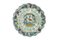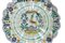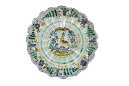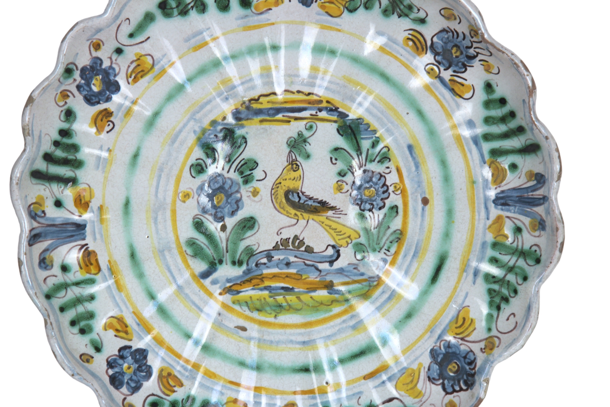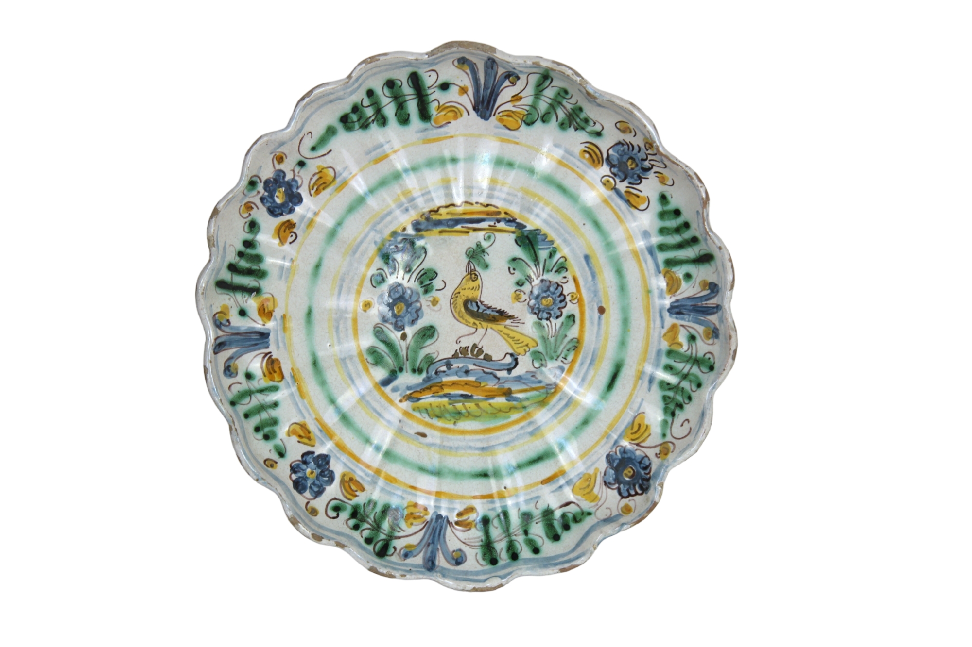 ALZATA in maiolica decorata, fondo decorato da volatile e fiori, la tesa ondulata dipinta in verde e blu XVIII secolo Ariano Irpino Ø cm 26,5