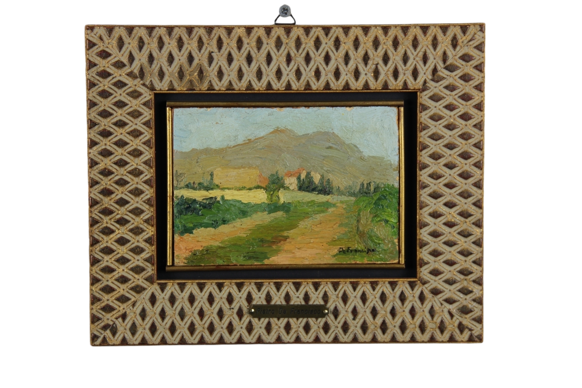 PIETRO DE FRANCISCO Piccolo olio su cartone raffigurante casolari in campagna primi 900 h cm 12 x 16,5 / cornice h cm 29 x 24