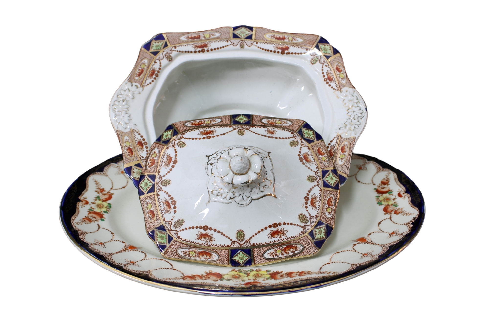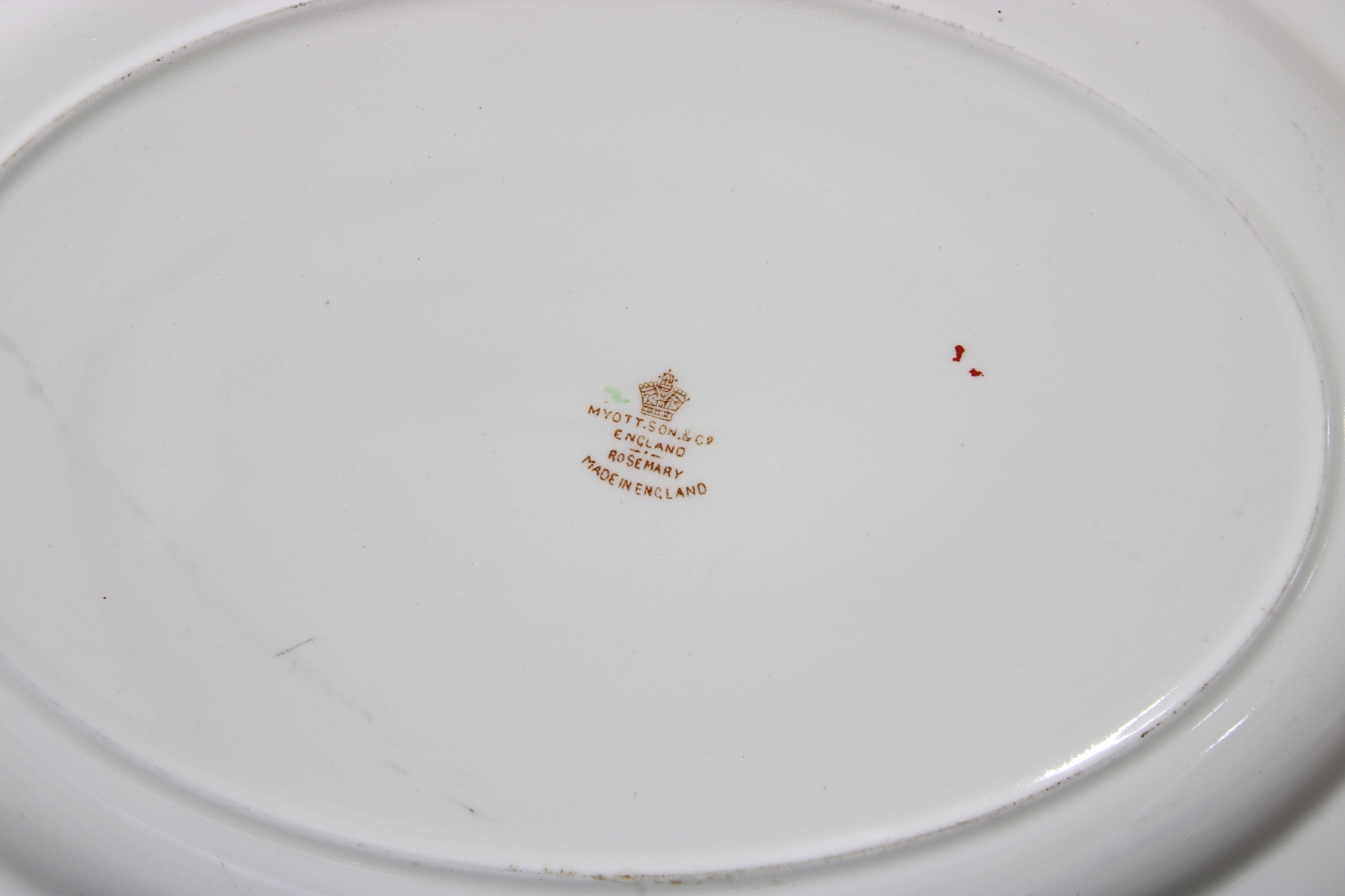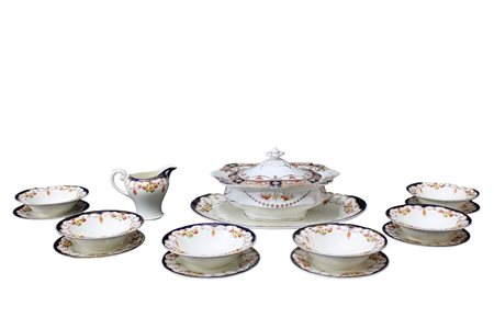 LOTTO COMPOSTO DA: 1 zuppiera, 1 vassoio,6 ciotole, 6 piattini e 1 salsiera in porcellana dipinta a motivi floreali manifattura Miot J.Son. E C England misure varie