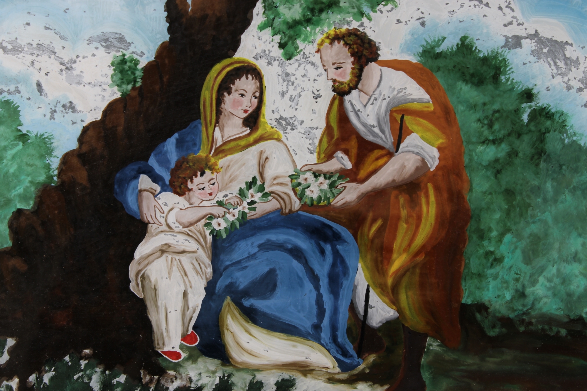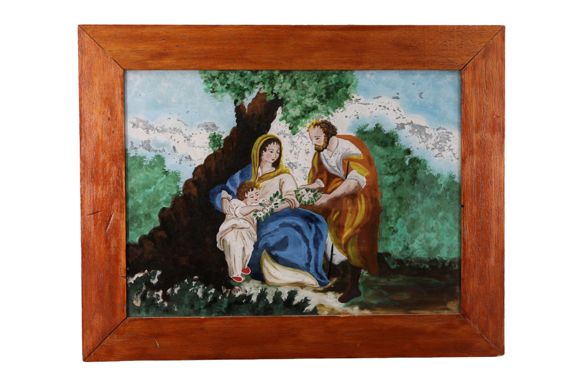 PITTURA SU VETRO raffigurante riposo d'Egitto dentro cornice in legno manifattura popolare Sicilia XIX secolo h cm 27 x 36