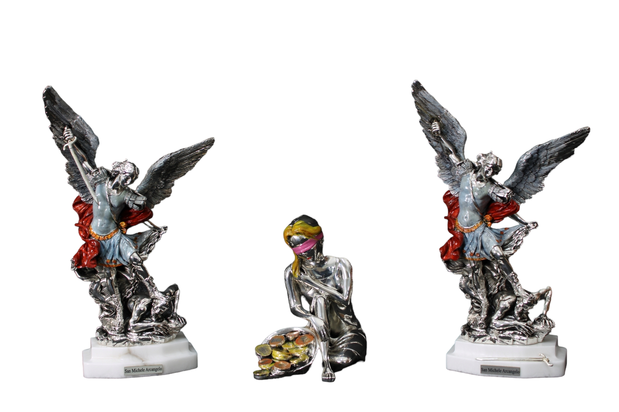 3 STATUETTE placate in argento raffigurante Due San Michele Arcangelo, 1 la Dea Fortuna XX secolo Italia h cm 20 x 12 x 17 / h cm 33 x 20 x 10