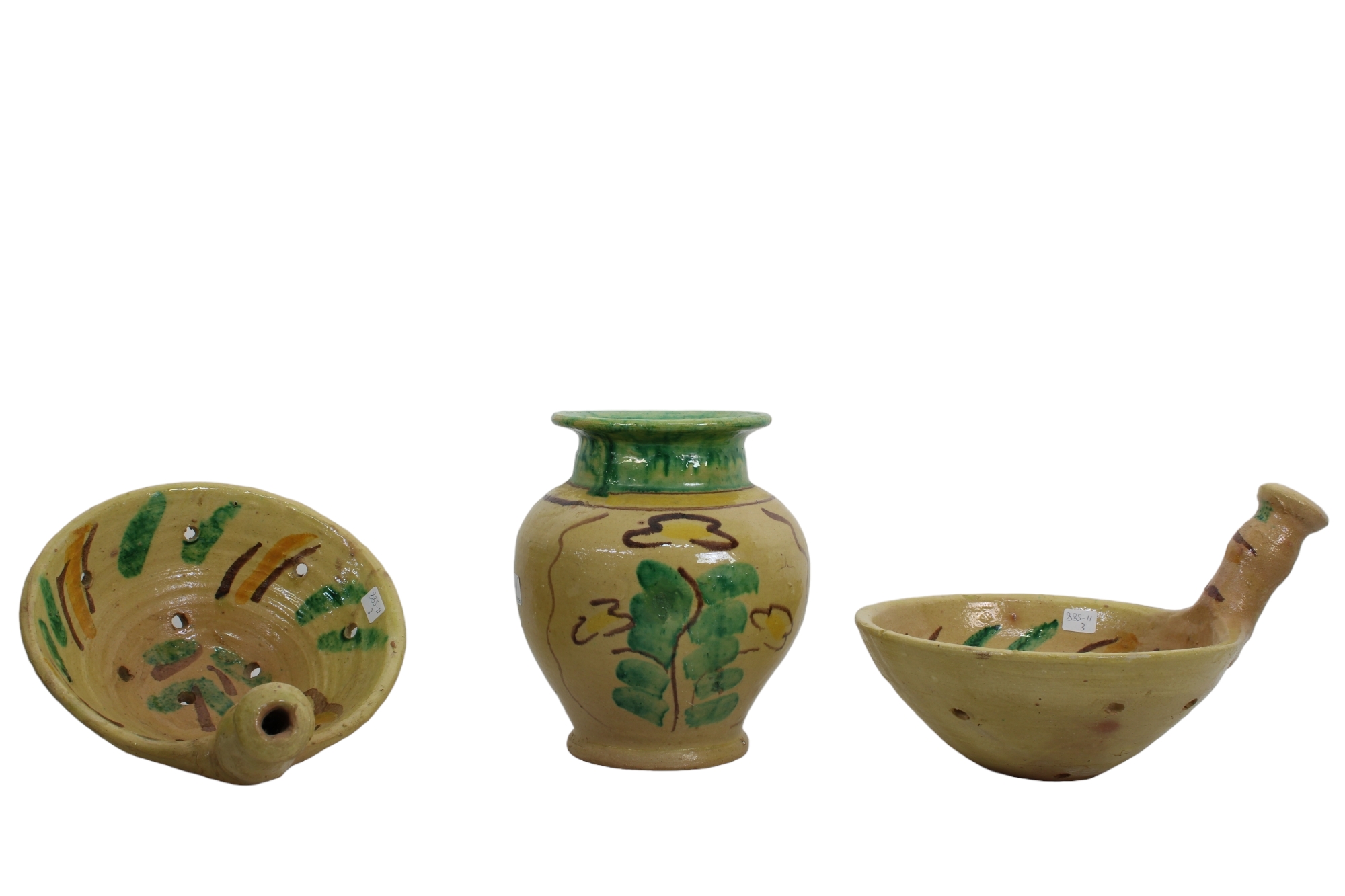 2 COLABRODO E 1 VASO in terracotta invetriata XX secolo Caltagirone h cm 20 x 17 / h cm 16 x 28 x 21