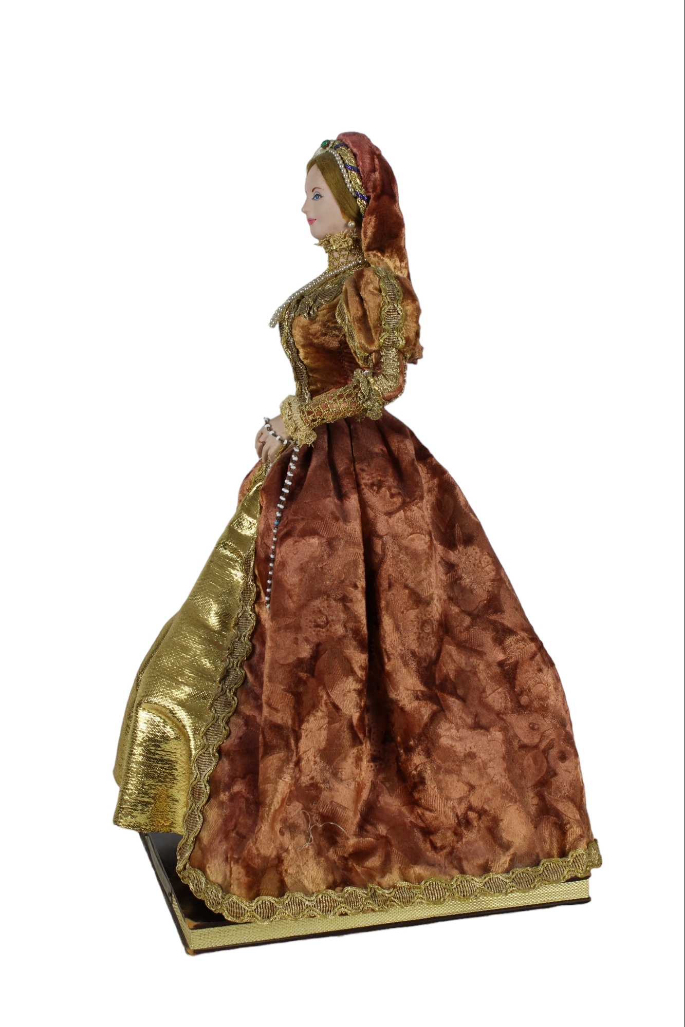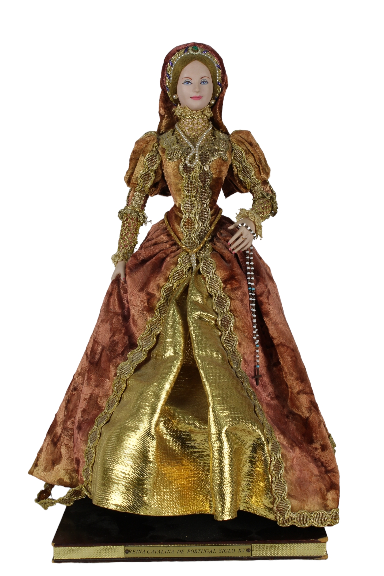 BAMBOLA Raffigurante Reina Catalina de Portugal,testa e arti in biscuit e abiti in tessuto manifattura inglese XX secolo h cm 44 x 23 x 23