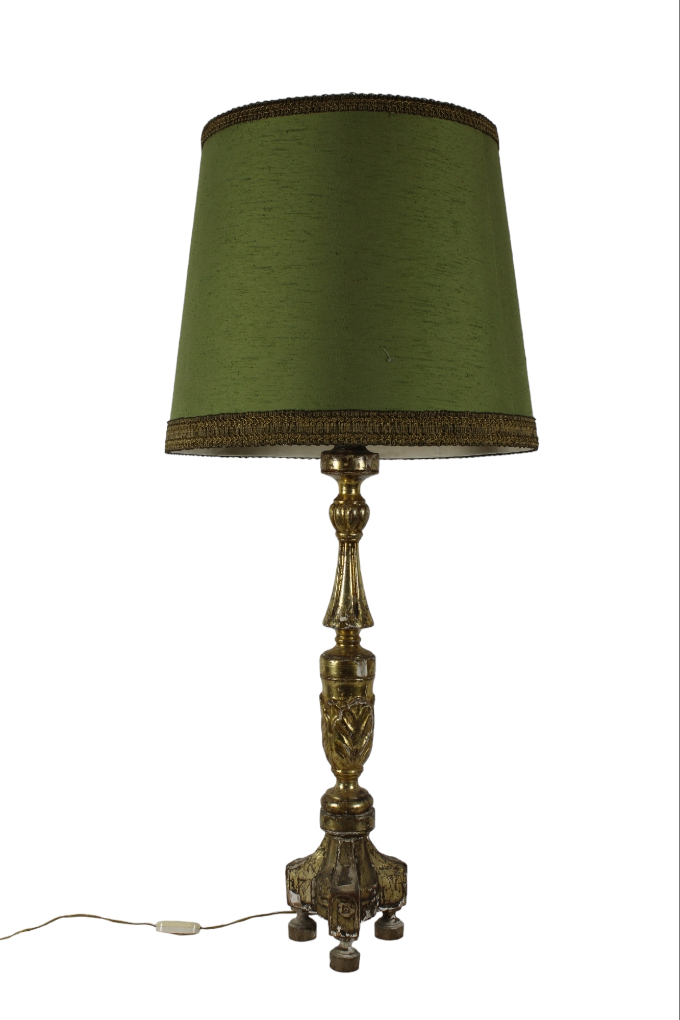 TORCERE in legno finemente scolpito e dorato ad argento e mecca con paralume in tessuto maestranze siciliane 1705-1720 h cm 98 x 42
