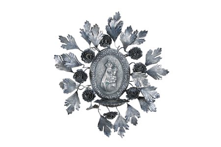 ACQUASANTIERA in argento, dentro ovale centrale raffigurante Madonna con Bambino coronati, il bordo esterno decorato da ramage fioriti XX secolo Sicilia h cm 20 x 17