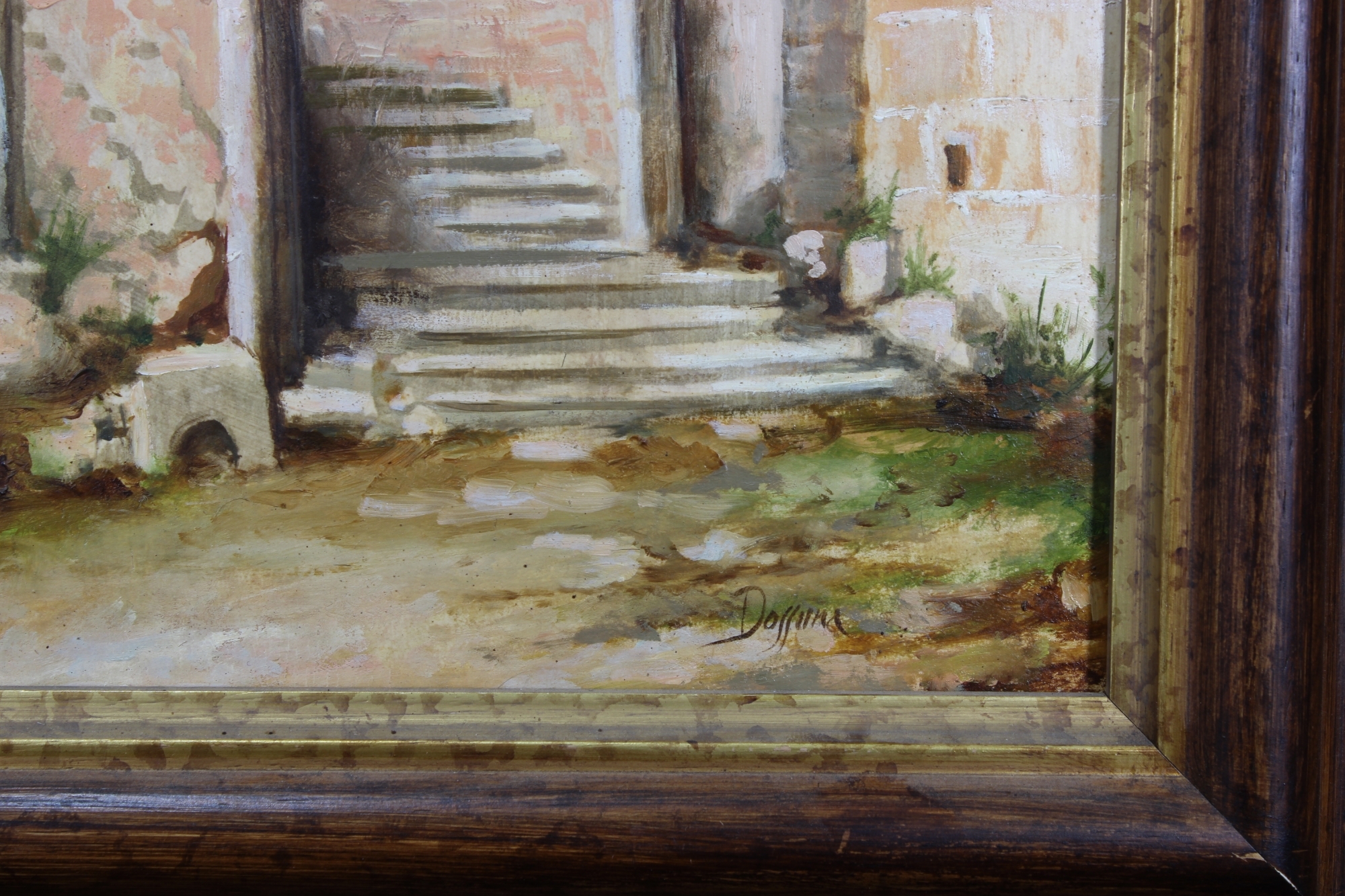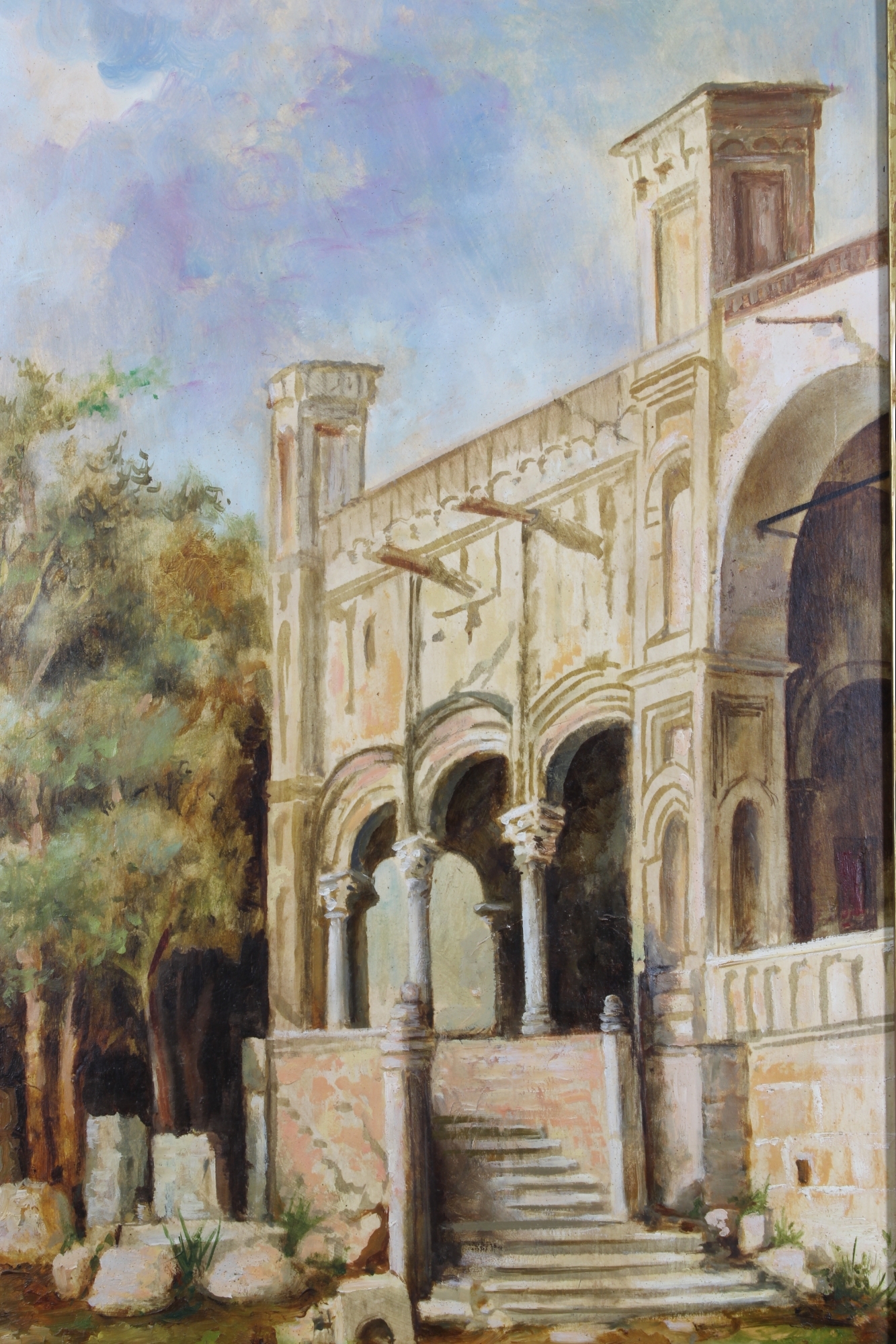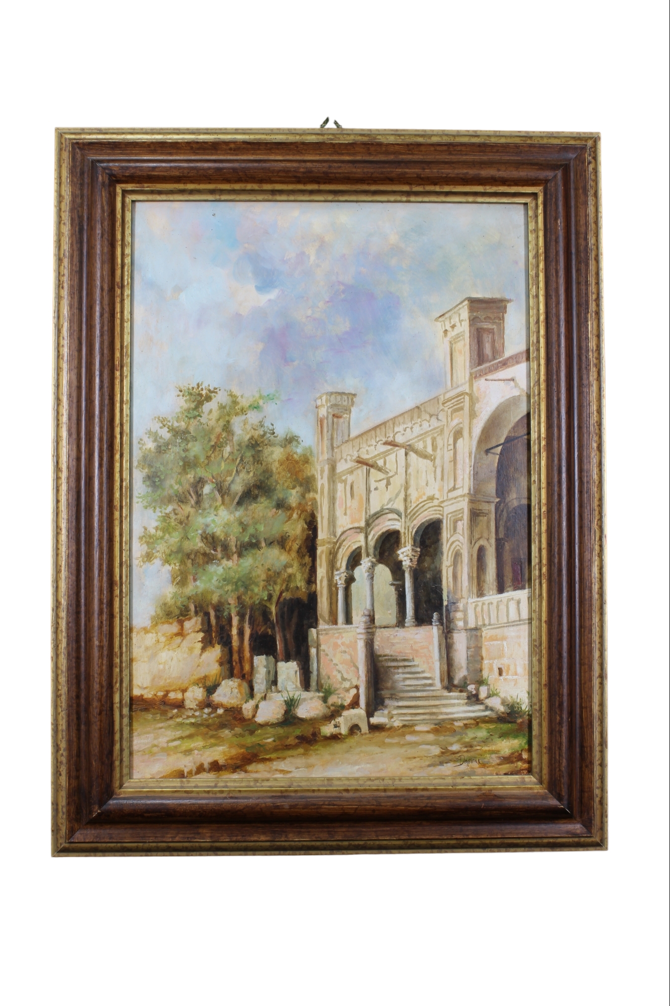 OLIO SU TAVOLA Raffigurante La Chiesa Santa Maria della Catena firmato in basso Dossuna Primi 900 Sicilia h cm 49 x 34 / cornice h cm 63 x 48