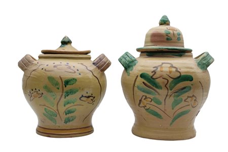2 BOCCE in maiolica con coperchio vecchia fattura Caltagirone h cm 34 x 27 / h cm 27 x 27