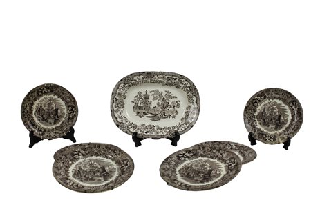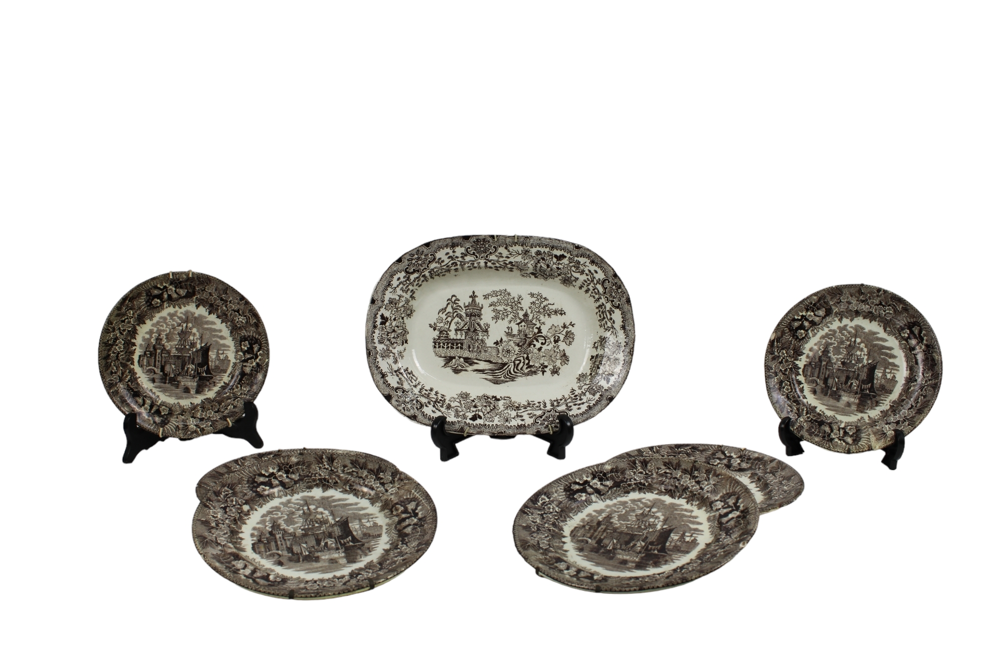 LOTTO DI 6 PIATTI E 1 VASSOIO in terraglia porcellanata dipinta raffigurante paesaggi manifattura Willow misure varie